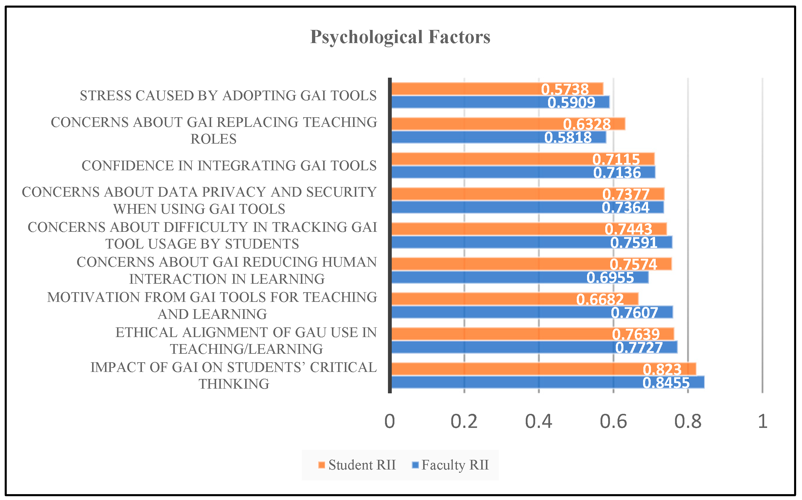 Figure 6) provides crucial insight into the emotional and cognitive undercurrents shaping GAI adoption. Both faculty and students identify the impact of GAI on students’ critical thinking as the most significant psychological concern (RII = 0.82–0.84), reflecting a deep-seated anxiety about automation displacing reasoning. Ethical alignment follows closely, suggesting that users perceive morality as a necessary companion to innovation.