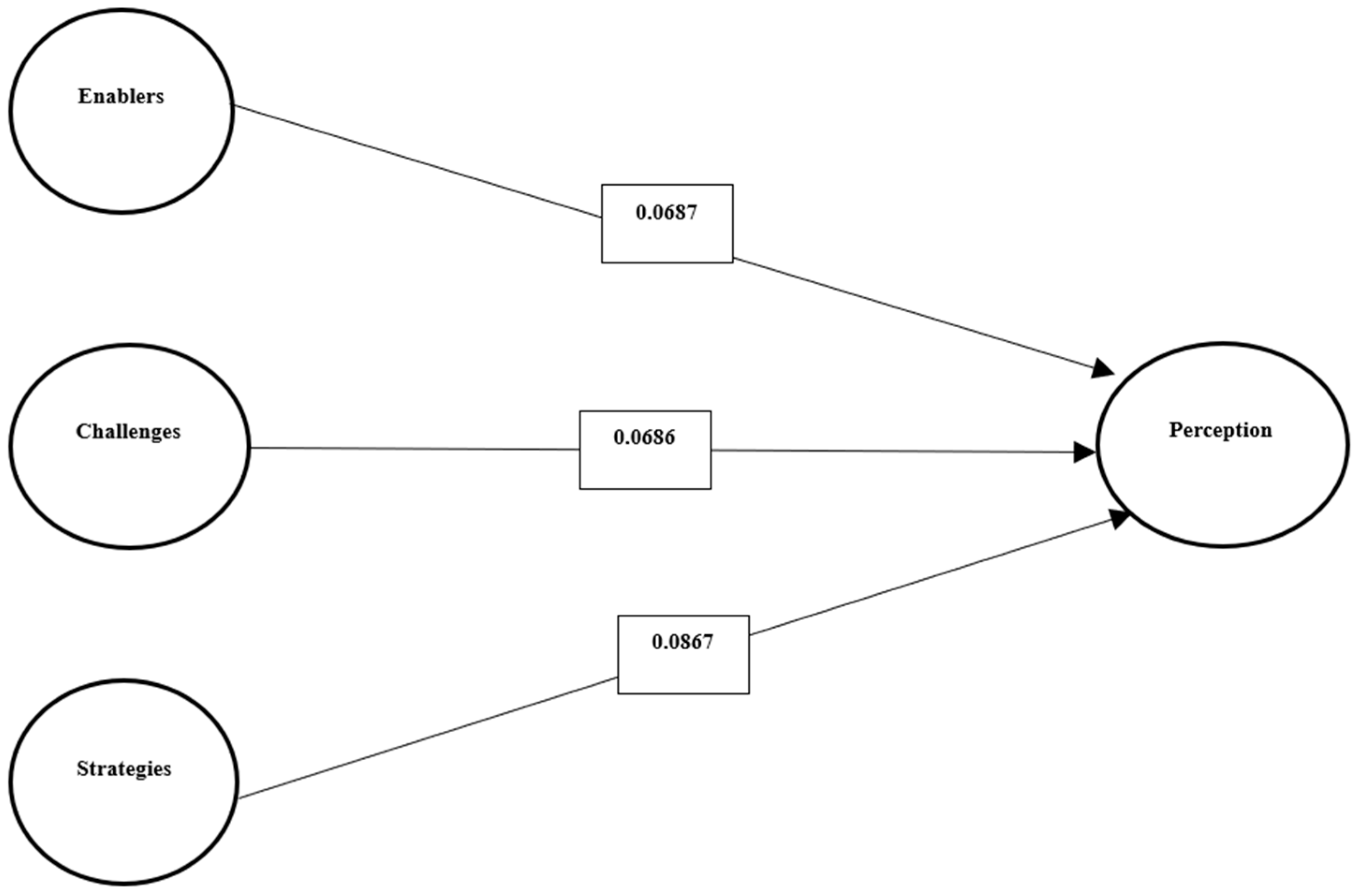Figure 8 illustrates the structural relationships among constructs and their standardized effects, visually highlighting how strategies, enablers, and challenges shape perception while psychological factors remain weakly connected. Consistent with the hypothesized directionality, Strategies, Challenges, and Enablers all influence Perception, while Psychological Factors exert no meaningful direct effect.