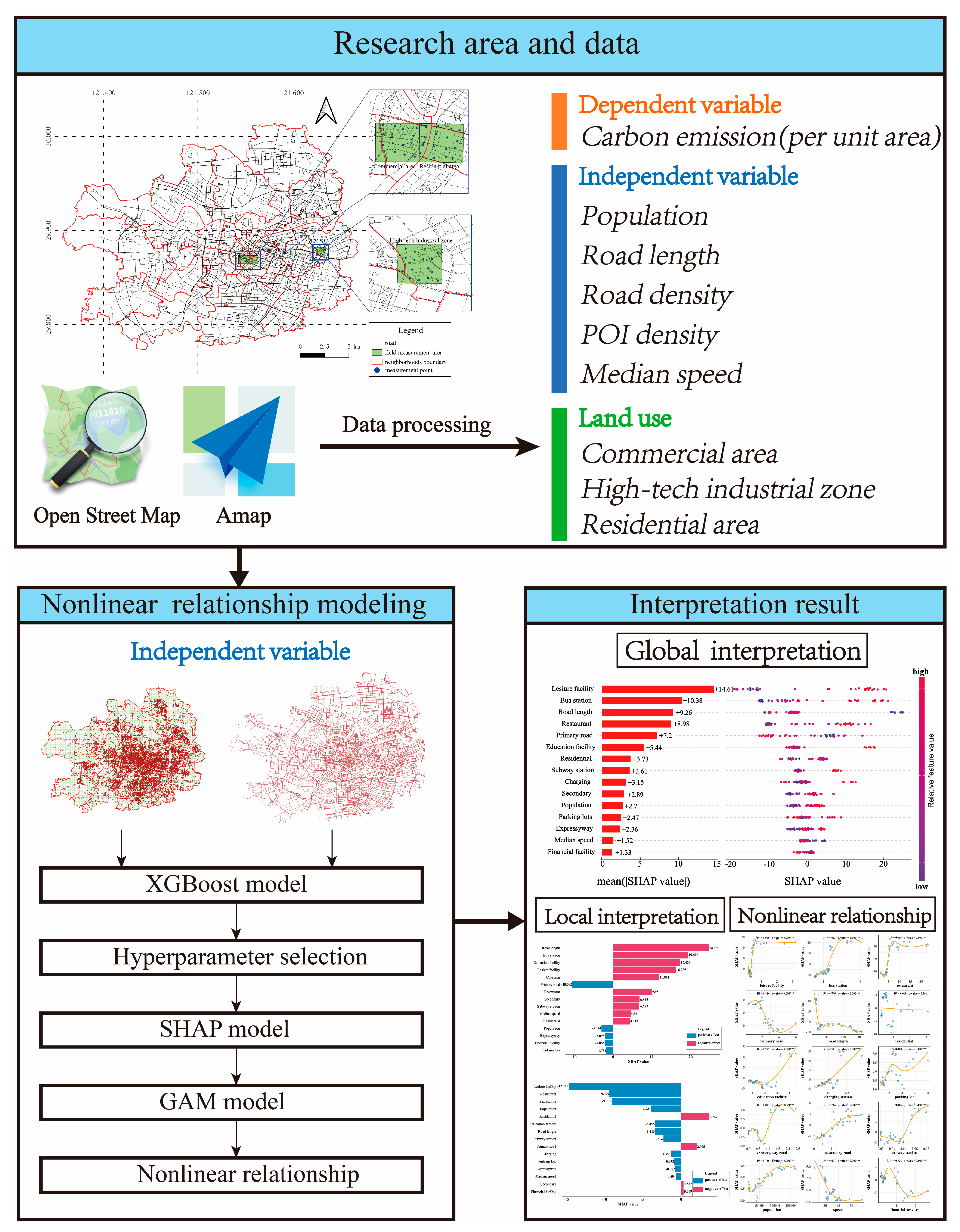 - Zhi, D.; Zhao, H.; Chen, Y.; Song, W.; Song, D.; Yang, Y. Quantifying the heterogeneous impacts of the urban built environment on traffic carbon emissions: New insights from machine learning techniques. Urban Clim. 2024, 53, 101765. [Google Scholar] [CrossRef]
