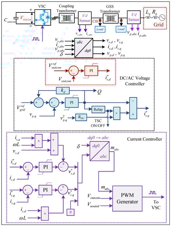 The proposed coordinated hybrid VAR compensator model consists of a STATCOM and a TSC, as shown in Figure 1. The basic configuration of a VSC-based STATCOM comprises a voltage source converter (VSC), a DC-link capacitor, and a coupling transformer, as illustrated in Figure 2. In this study, a balanced three-phase system is considered, and the STATCOM is modeled using the synchronous rotating reference frame (dq-frame). Switching harmonics are neglected in control-level modeling to simplify the analysis.