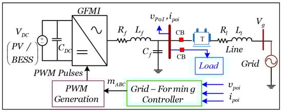 A topology of a grid-connected IBRs system with GFM control is illustrated in Figure 8. In this configuration, the IBRs, comprising a PV system and a BESS, are connected to the grid via a circuit breaker. The GFM-controlled IBRs and the grid are interfaced at the point of interconnection (POI). A three-phase voltage source inverter (VSI), governed by a droop-based GFM control scheme, is employed to regulate the power exchange and maintain system stability. are filter