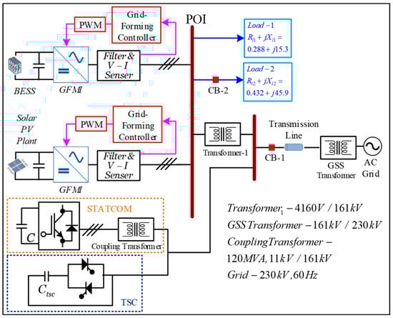 The remainder of the paper is organized as follows: Section 2 describes the proposed hybrid VAR compensator, including the mathematical modeling of the VSC-based STATCOM and TSC. Section 3 presents the GFM-controlled PV and BESS units along with their control strategies. Section 4 details the test system. Section 5 discusses the results obtained from various case studies. Finally, Section 6 concludes the paper.
