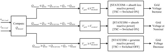 A TSC and a VSC-based STATCOM are used in the coordinated hybrid VAR compensator to provide the best possible balance between high-capacity reactive power supply and quick dynamic response. The coordinated strategy is shown in Figure 4. In this set up, the STATCOM ensures fine voltage regulation under dynamic and transient operating situations by providing quick and continuous reactive power control. On the other hand, in steady-state conditions, the TSC, which is made up of banks of capacitors controlled by thyristors, effectively provides large-step reactive power compensation with low switching losses. While the TSC manages the bulk reactive demand and the STATCOM corrects for rapid voltage fluctuations, the two systems work in tandem to provide smooth reactive power management across a broad working range. In addition to improving transient response and system voltage stability, this hybrid coordination lowers converter stress and boosts overall efficiency. As a result, in contemporary low-inertia, inverter-dominated power systems, the coordinated STATCOM + TSC structure provides a practical and affordable means of preserving voltage and reactive power balance. The coordinated hybrid VAR compensator works according to the following cases: