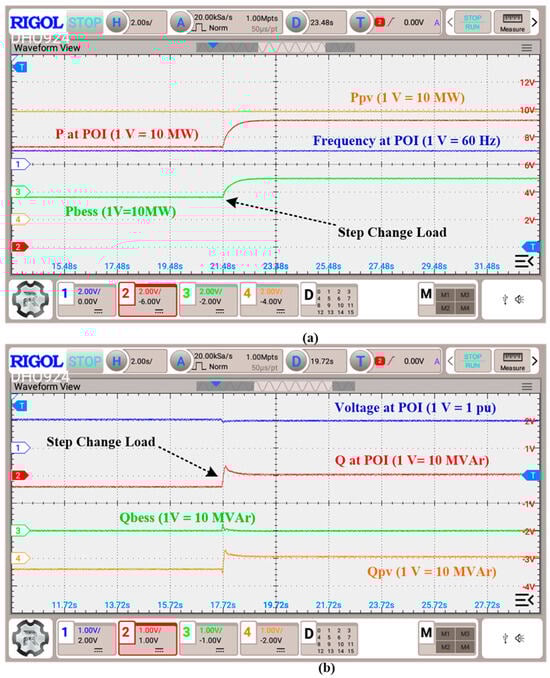 This case study investigates the dynamic response and fault-handling capabilities of the proposed hybrid VAR compensator and GFMI-based PV and BESS during a severe grid disturbance, namely, a three-phase fault on the transmission line. The objective is to assess the system’s voltage and frequency stability, power-sharing capability, and fault ride-through performance under extreme fault conditions. The simulation results are presented in Figure 15a,b. At the start of the case study, the system operates under normal conditions with the GFMI-PV generating power at the MPP, and the GFMI-BESS operating in support mode to balance any fluctuations in demand and generation. A three-phase fault is then introduced on the transmission line.