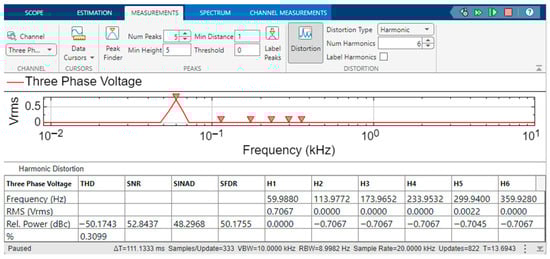 Figure 16 and Figure 17 present the harmonic analysis of the three-phase grid voltage and current at the POI. The measured total harmonic distortion (THD) values are 0.3% for voltage and 0.13% for current, respectively. These values are significantly lower than typical grid code limits (e.g., IEEE-519), which generally permit voltage THD up to 5% and current THD up to 8% for distribution-level systems. The low harmonic content confirms that the coordinated operation of the STATCOM, TSC, and GFM-controlled PV/BESS does not introduce adverse switching or resonance effects into the network despite the high-power converter switching activity.