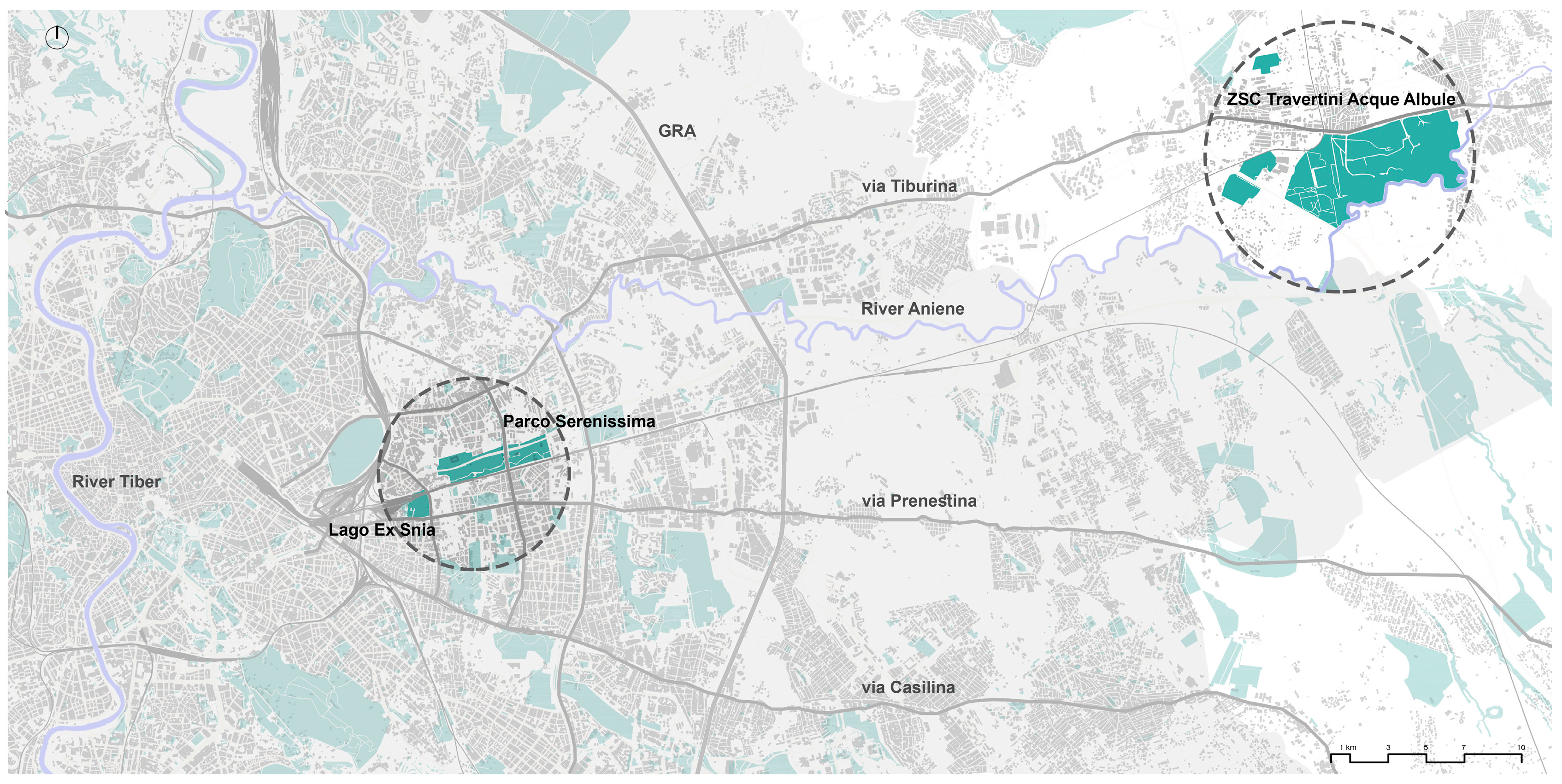 - corridor/metropolitan scale—scenario-building for the Rome–Tivoli axis to test how the three sites could act as strategic nodes within a broader greenway integrating formal parks, informal habitats and heritage sites.