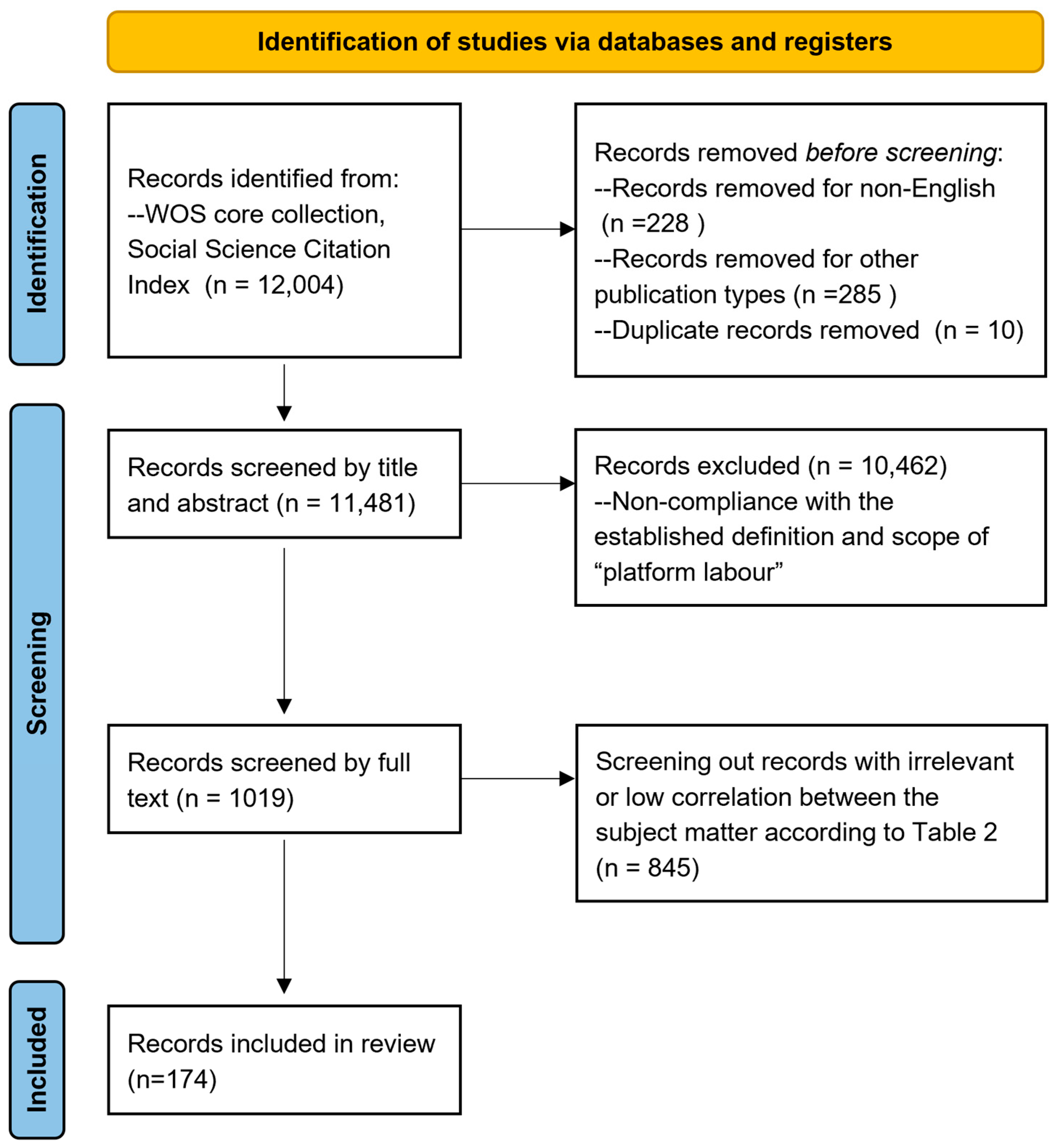 | Searching keywords | TS = (“platform labour” OR “platform work” OR “labour platform” OR “gig work” OR “digital labour” OR “crowdwork” OR “on-demand work”) |