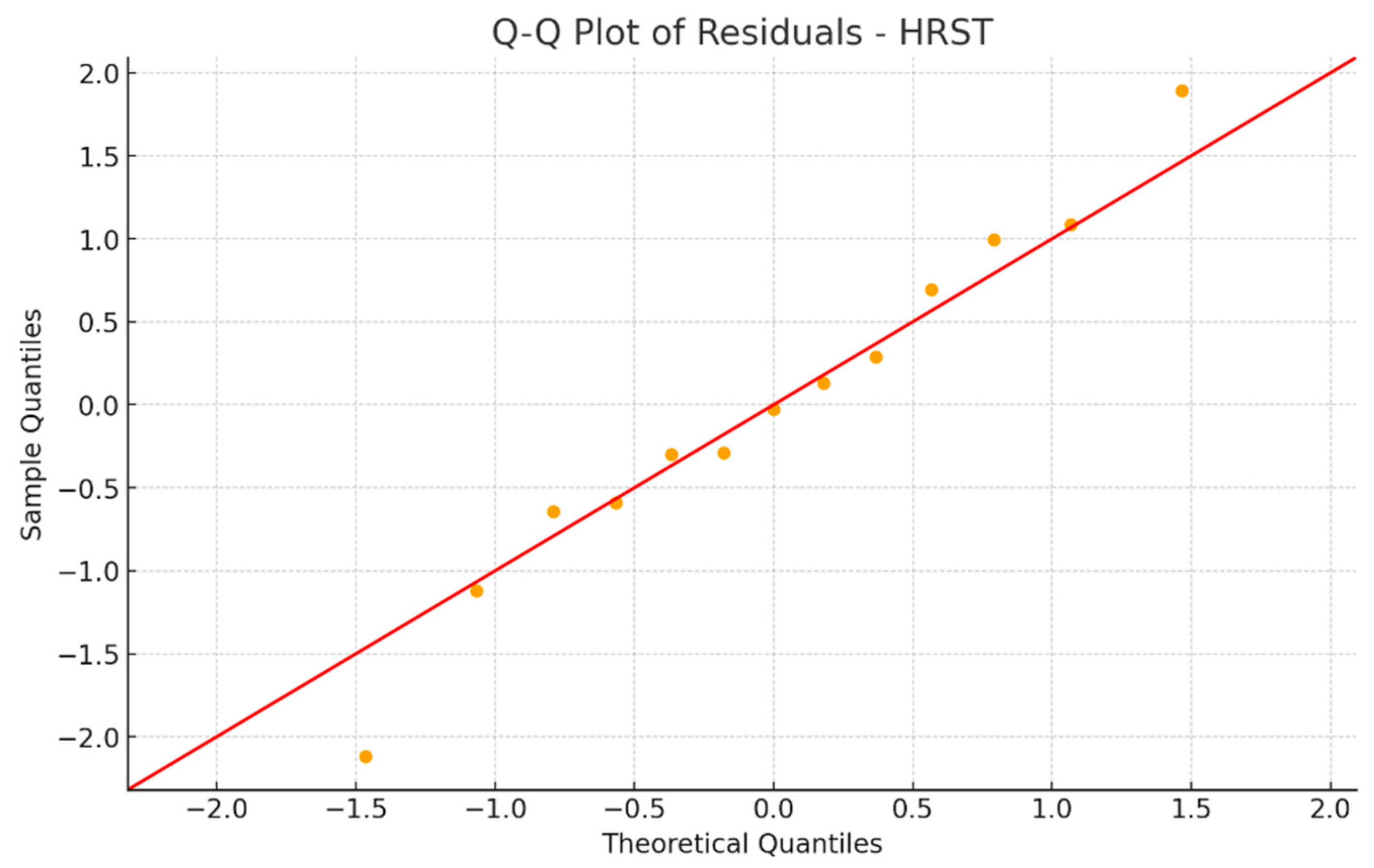 The p-values associated with individual coefficients were examined to determine the statistical significance of each predictor variable. The Durbin–Watson statistic was employed to test for the presence of first-order autocorrelation in the residuals, while the Breusch–Pagan test was used to detect potential heteroscedasticity.