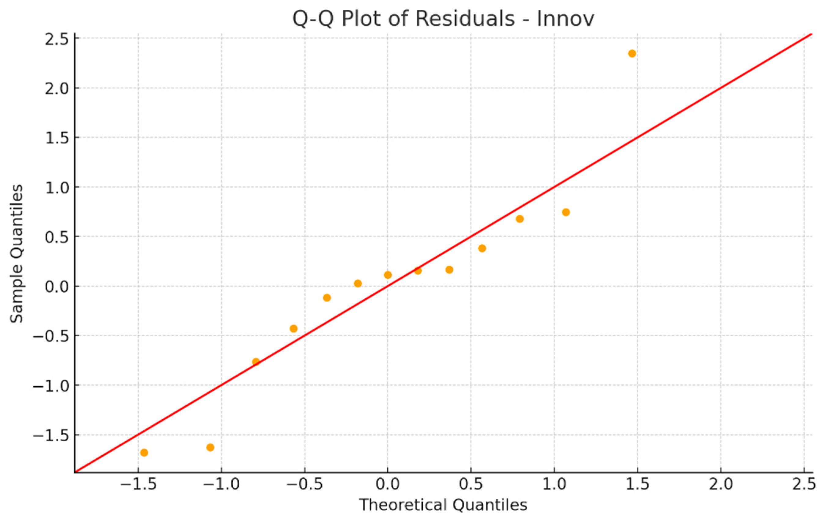 To assess the assumption of normality in the residual distribution, both the Jarque–Bera test and Q–Q plot analysis were applied. Finally, the Variance Inflation Factor (VIF) was computed to identify potential multicollinearity issues among the investment-related predictors, ensuring the stability and interpretability of the regression estimates.