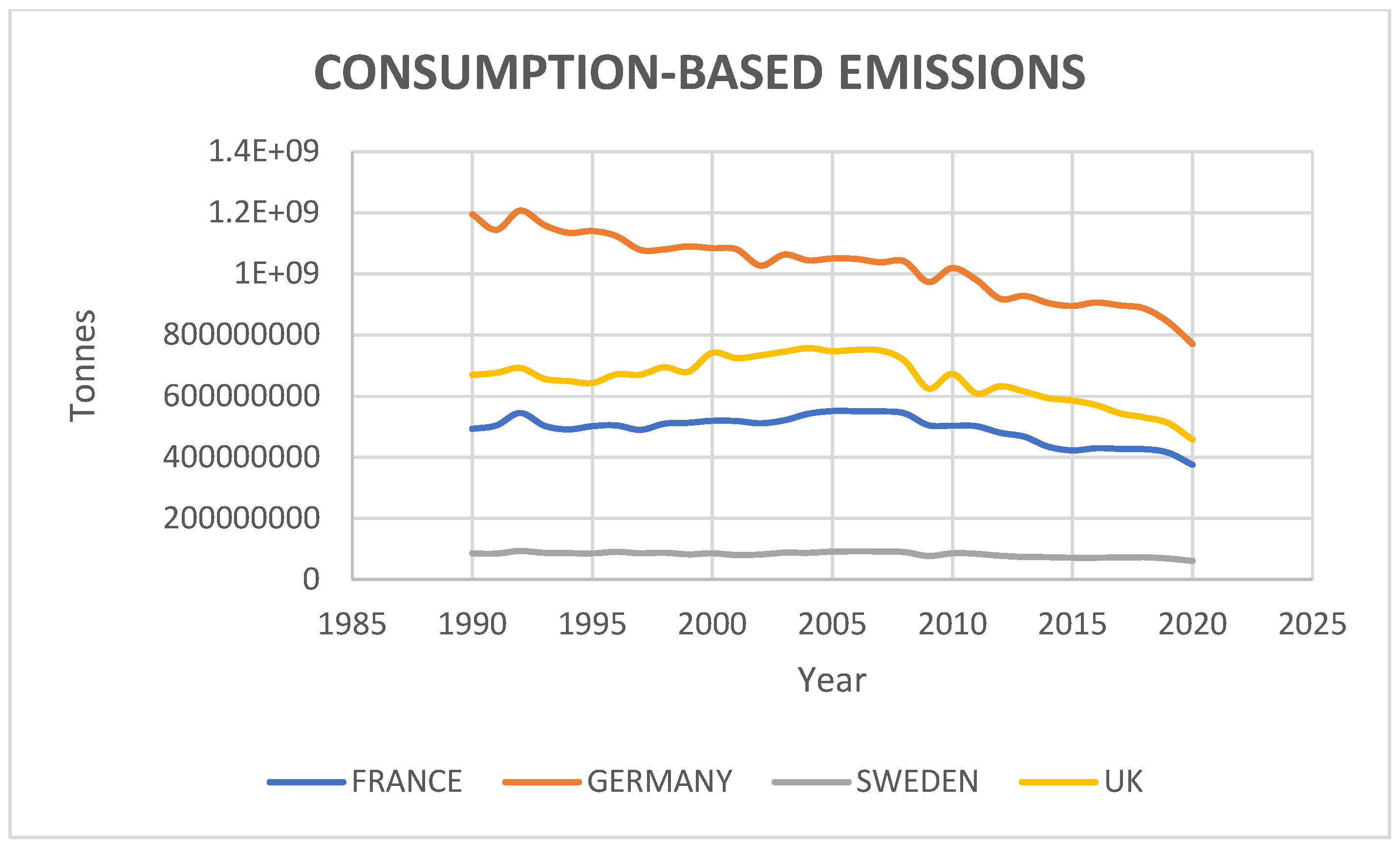 - Our World in Data. 2025. Available online: https://ourworldindata.org/grapher/production-vs-consumption-co2-emissions?tab=table&country=FRA~SWE~DEU~GBR&tableFilter=selection (accessed on 21 June 2025).