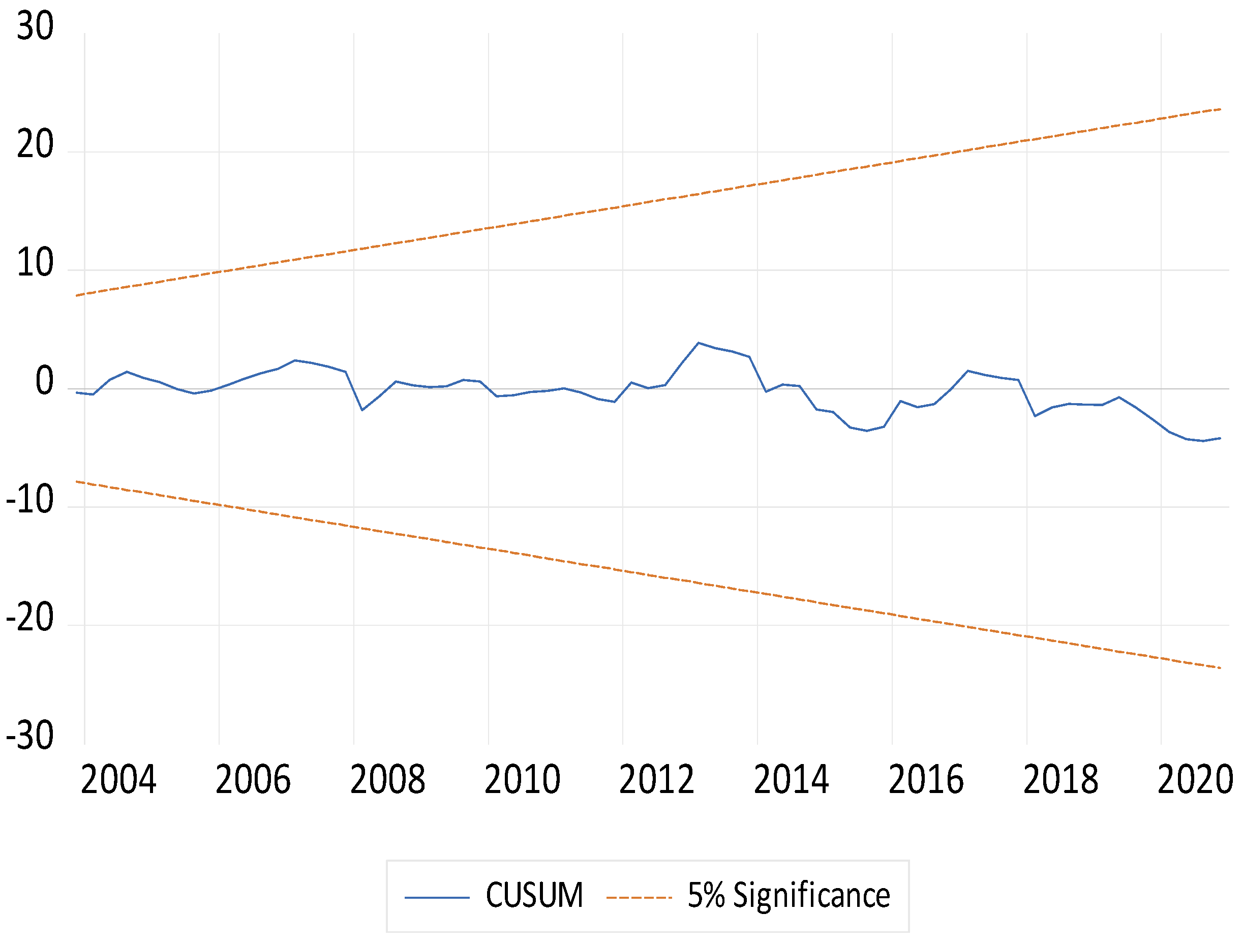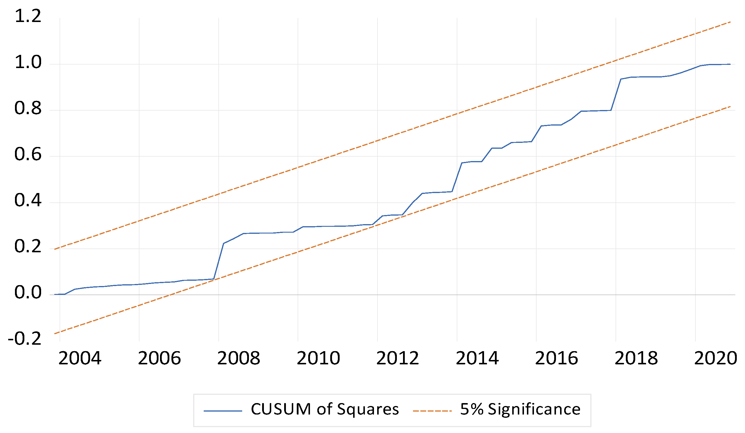 - Brown, R.L.; Durbin, J.; Evans, J.M. Techniques for testing the constancy of regression relationships over time. J. R. Stat. Soc. Ser. B Stat. Methodol. 1975, 37, 149–163. [Google Scholar] [CrossRef]
