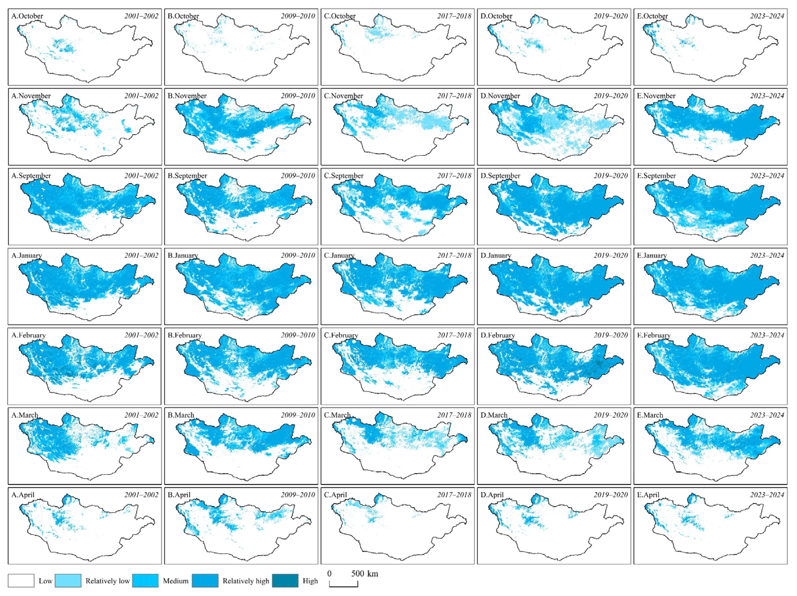 - Sa, C.; Meng, F.; Luo, M.; Li, C.; Wang, M.; Adiya, S.; Bao, Y. Spatiotemporal variation in snow cover and its effects on grassland phenology on the Mongolian Plateau. J. Arid Land 2021, 13, 332–349. [Google Scholar] [CrossRef]