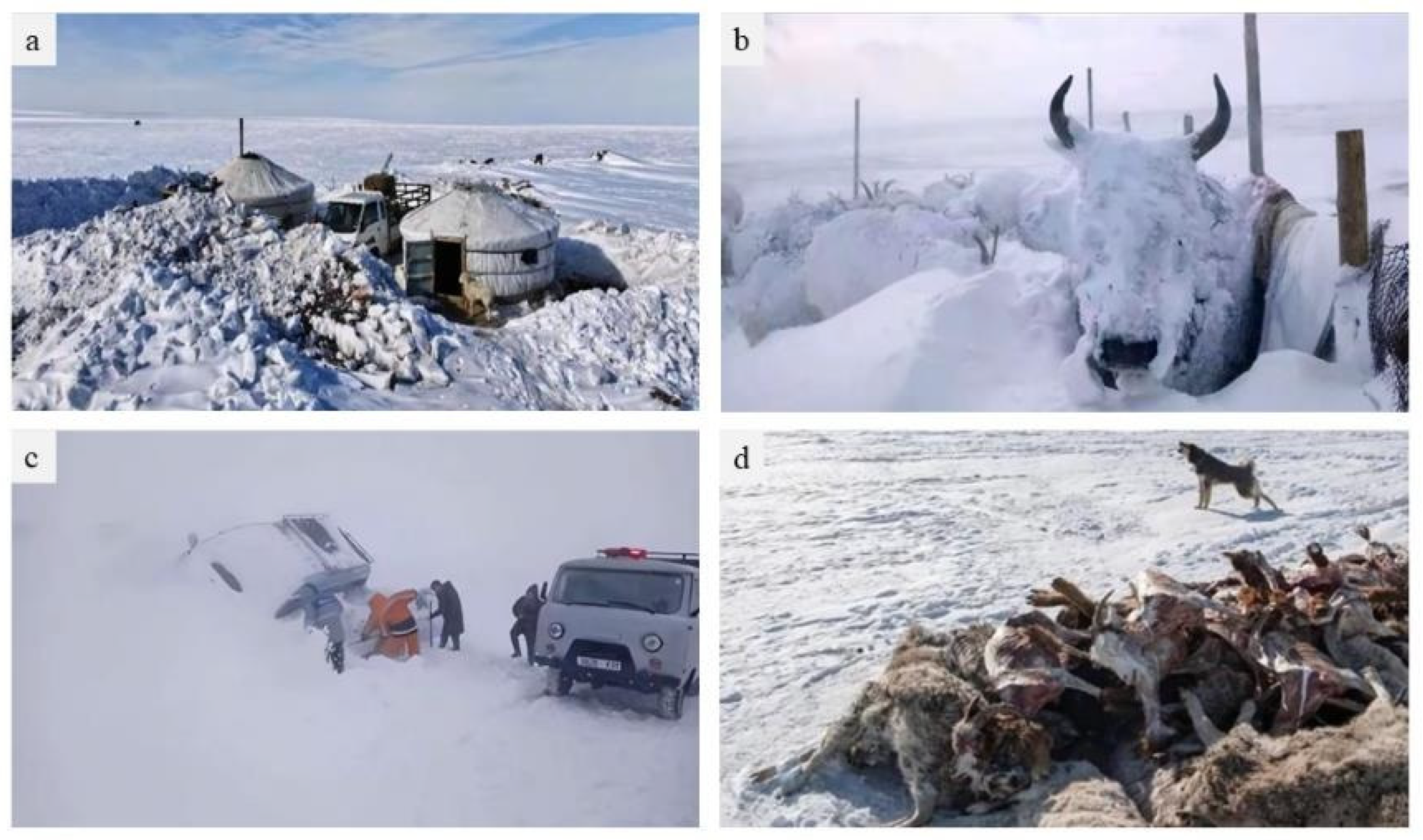 - Otani, S.; Onishi, K.; Kurozawa, Y.; Kurosaki, Y.; Bat-Oyun, T.; Shinoda, M.; Mu, H. Assessment of the effects of severe winter disasters (Dzud) on public health in Mongolia on the basis of loss of livestock. Disaster Med. Public Health Prep. 2016, 10, 549–552. [Google Scholar] [CrossRef] [PubMed]