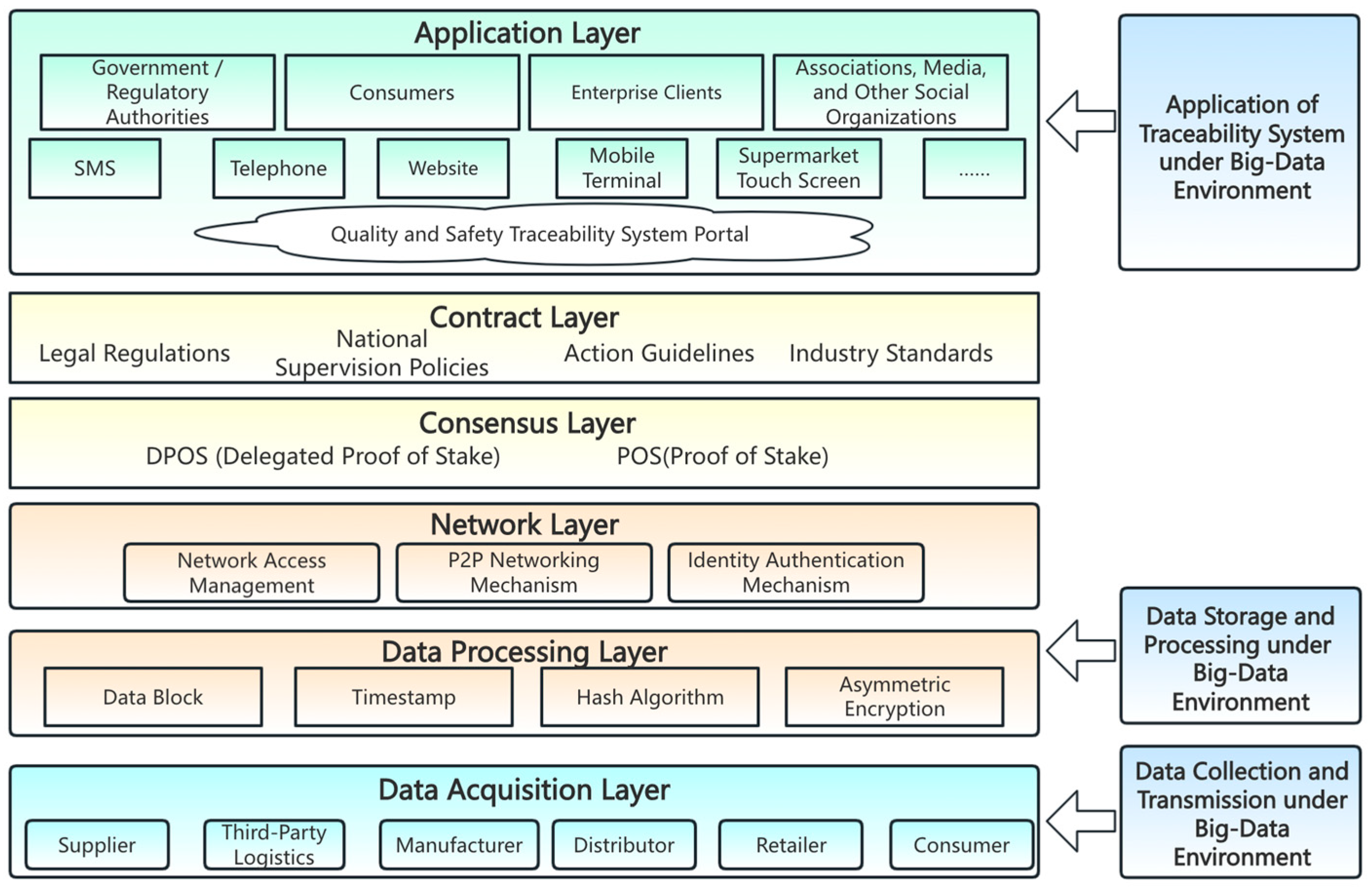 - Data acquisition layer: Collects life-cycle information from suppliers, manufacturers, third-party logistics providers, distributors, retailers, and consumers.