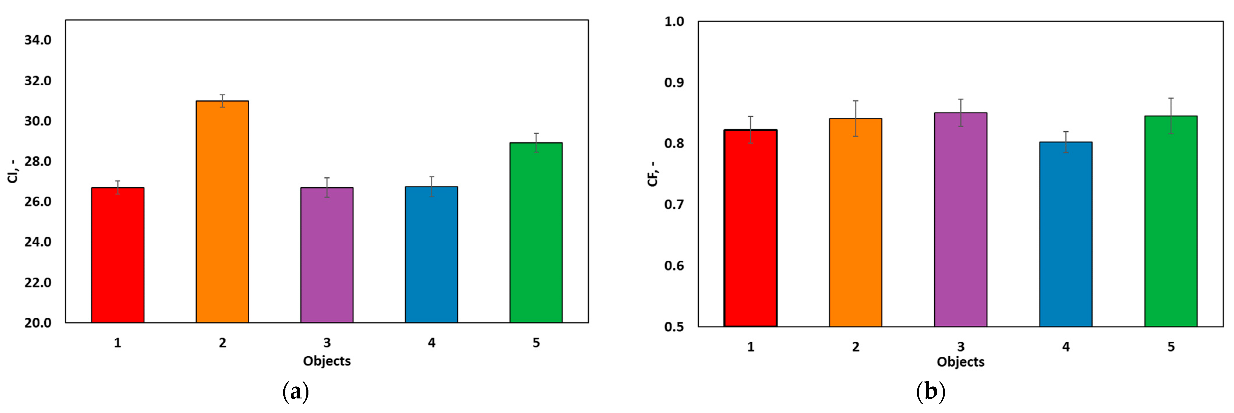- Concentration index (Cin, -) of elements in biomass, calculated as the ratio of metal concentration in plants grown on substrates watered with industrial wastewaters to the concentration of metals in plants from control objects;