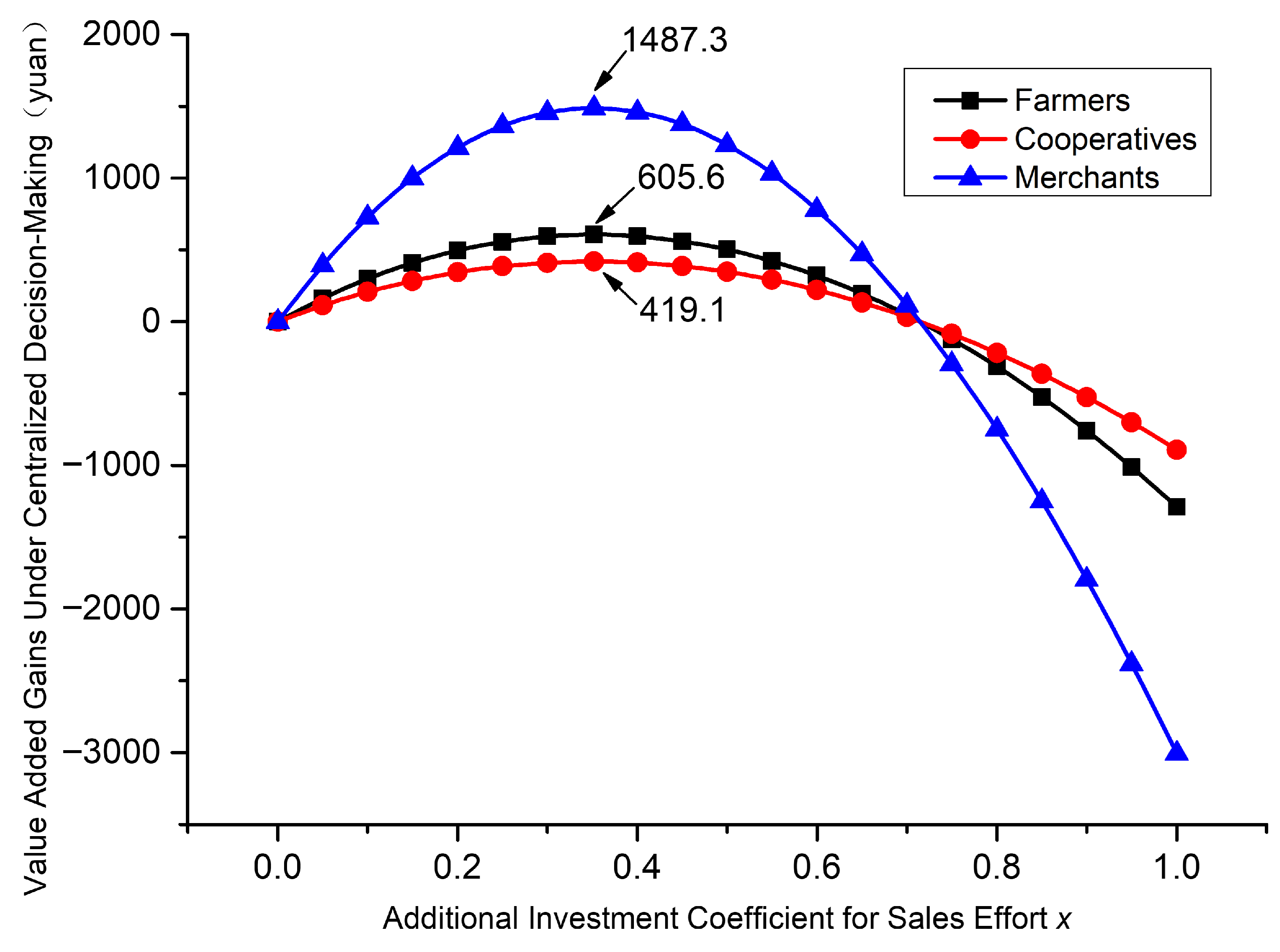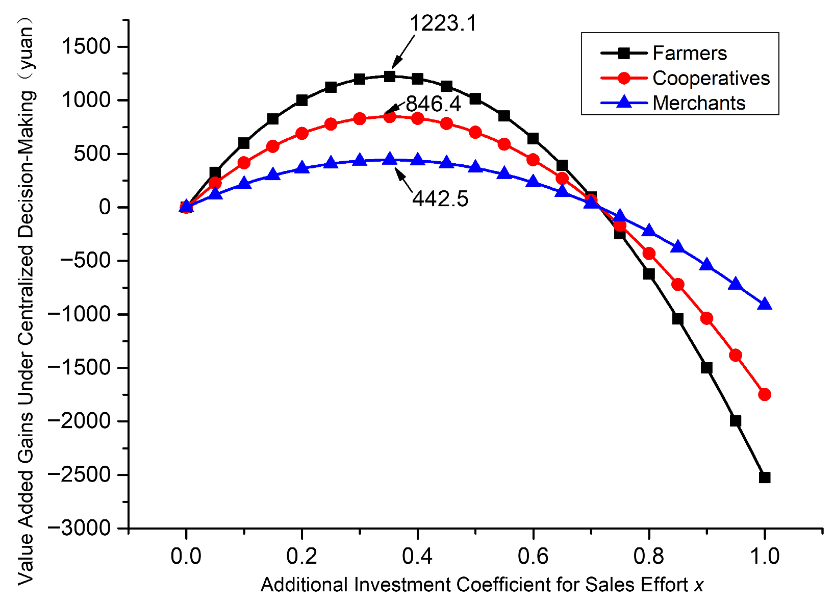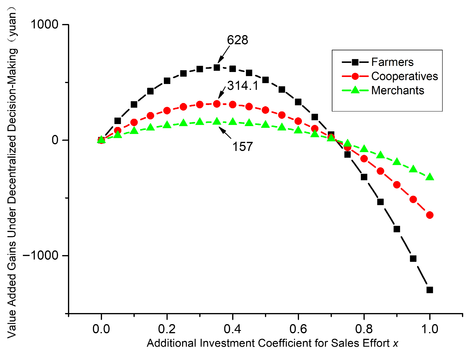 - Under decentralized decision-making, the payoffs of the respective stakeholders are as follows:Optimal Revenue of Farmers:CNY, CNY/kgOptimal Revenue of Cooperatives:CNY, CNY/kgOptimal Revenues of Retailers:CNY, CNY/kgkg