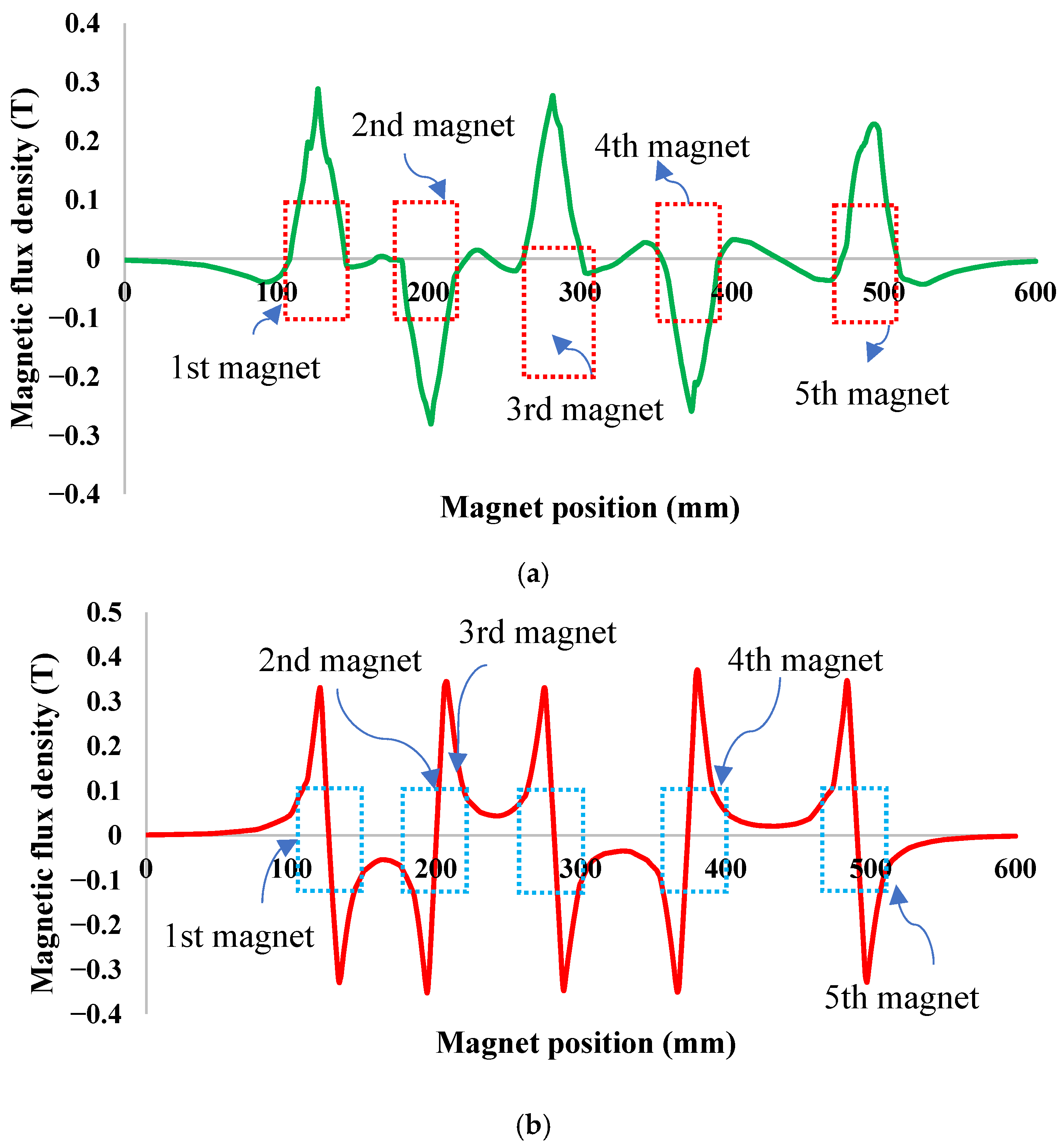 Figure 3a,b show that the magnetic field around the first and second magnets is highly distorted and undergoes polarity reversal. In contrast, the third magnet is exposed to a smoother and more symmetric field. Furthermore, the transient flux–density evolution in