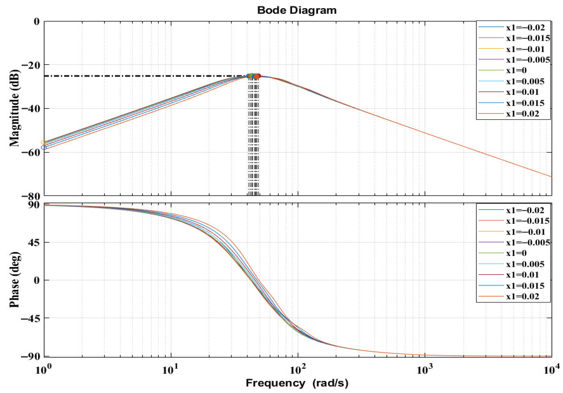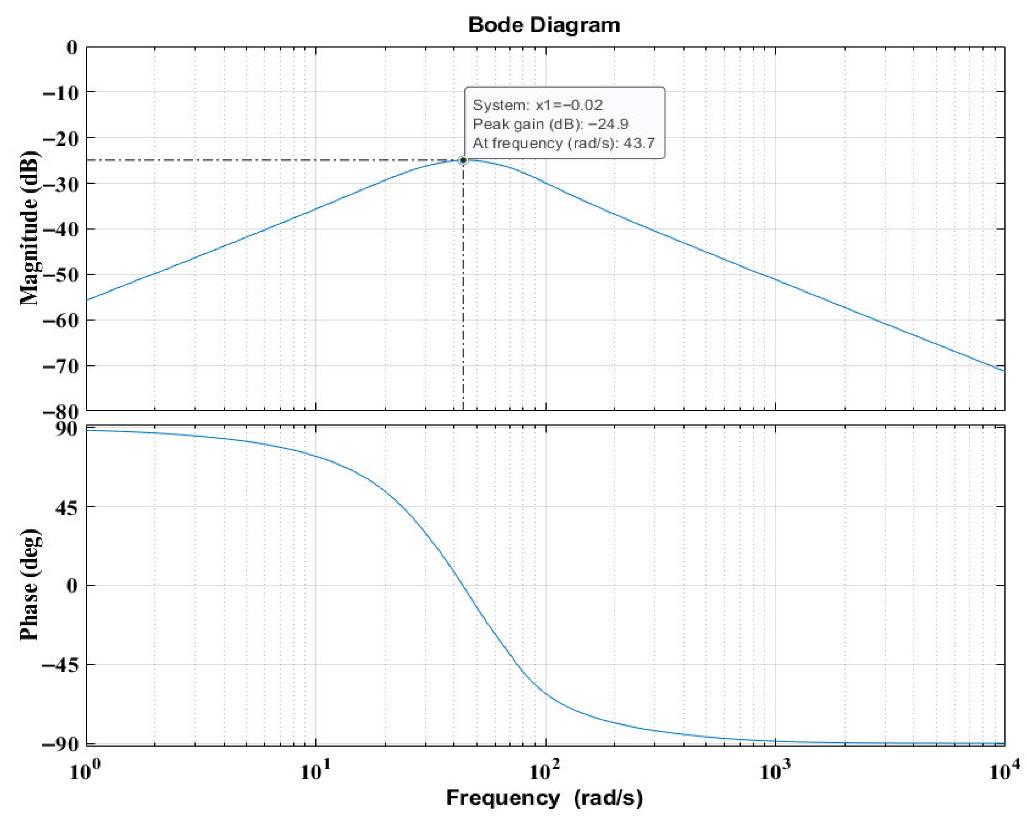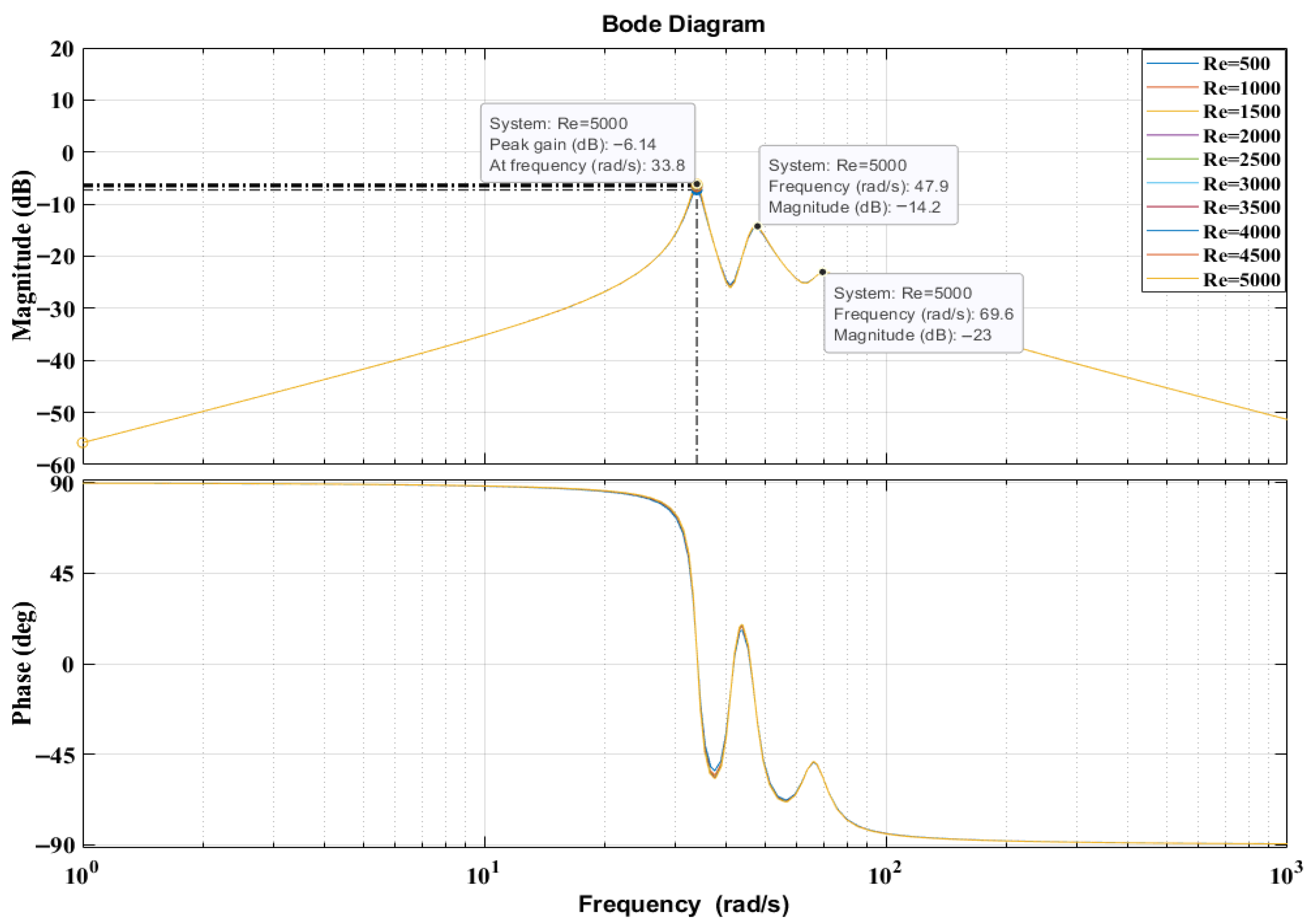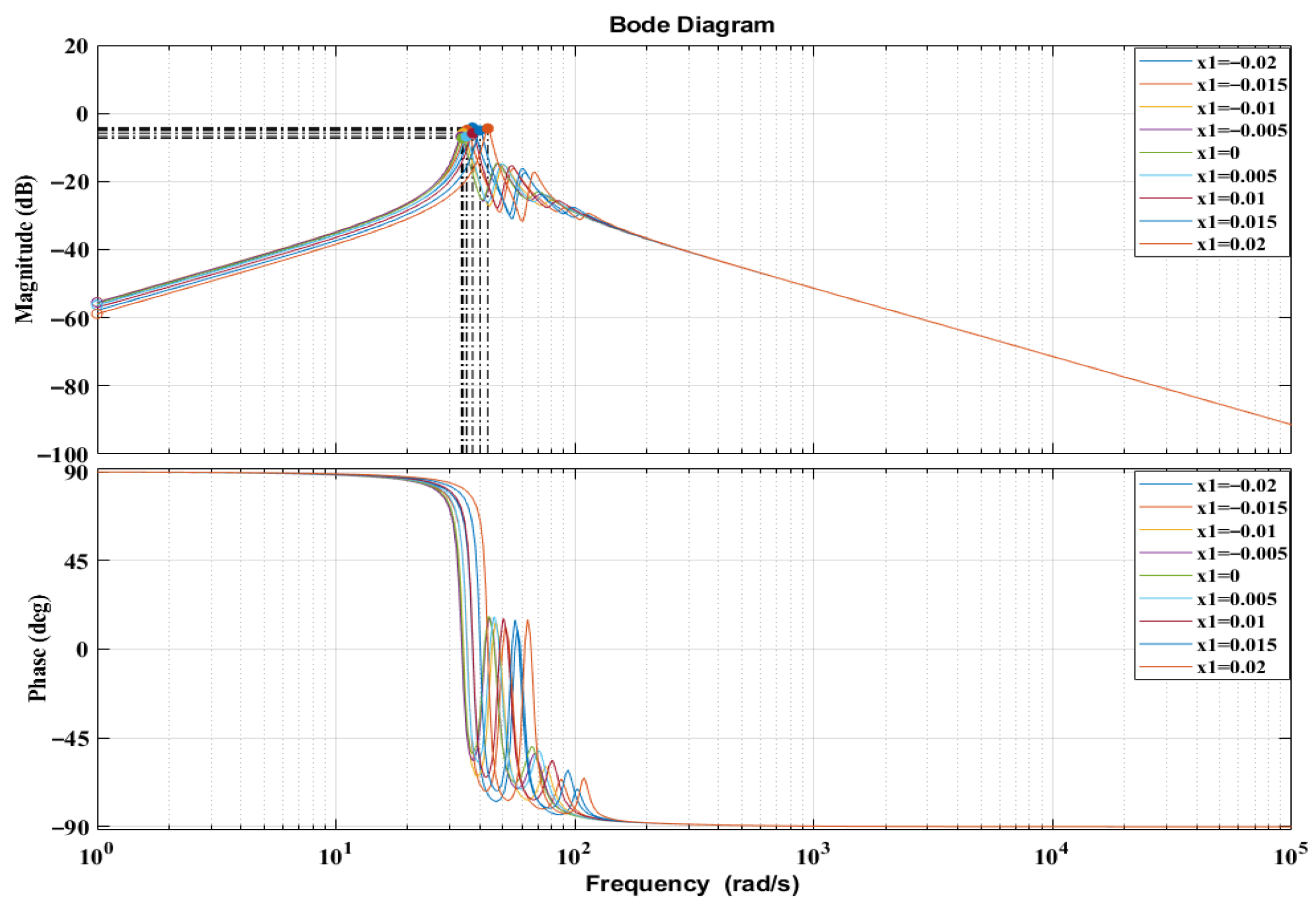 Figure 5 presents the Bode diagram of the 3DOF generator system evaluated at its equilibrium position. The frequency response was obtained by linearising the nonlinear electromechanical model around the static operating point and analysing the transfer function between the applied external excitation force and the floating magnet’s displacement. The magnitude plot does not exhibit a sharp resonance peak because the electromagnetic coupling introduces distributed damping and stiffness effects that broaden the response and suppress high-amplitude oscillation. Nevertheless, the system’s resonance behaviour is clearly visible: the maximum gain occurs at approximately 43.7 rad/s, confirming the dominant natural frequency of the coupled 3DOF configuration. The corresponding phase plot shows the expected transition from +90° at low frequencies to −90° at high frequencies, further validating the model’s dynamic consistency.