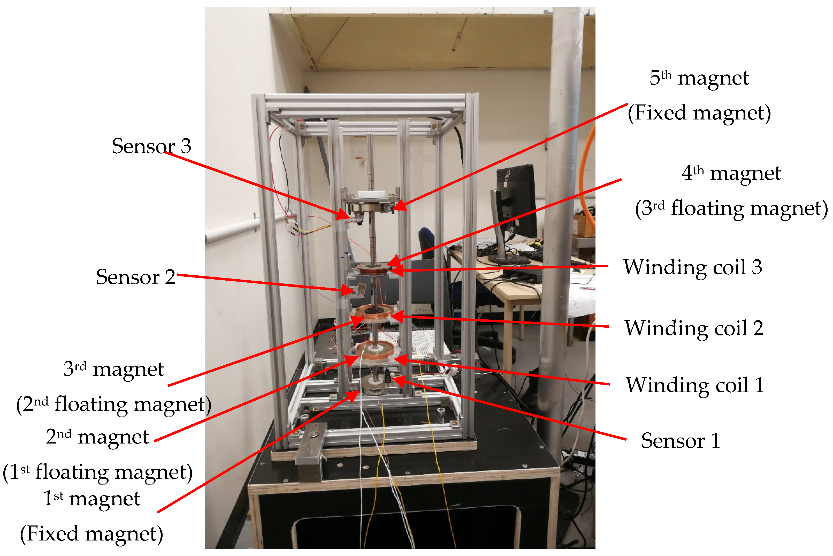 Figure 1, the equilibrium height of the 3DOF oscillator is 372 mm. For the equilibrium position, the separation distance between the first and second magnet is 59 mm, and the distance between the second and third magnet is 65 mm. Moreover, the distance between the third and 4th magnet is 79 mm, and the separation distance between the 4th and 5th is 104 mm. Three winding coils have been added to the test rig, and both winding coils have been connected to the data acquisition system to capture the induced voltages. A floating magnet connected the servo motor using a fishing line.