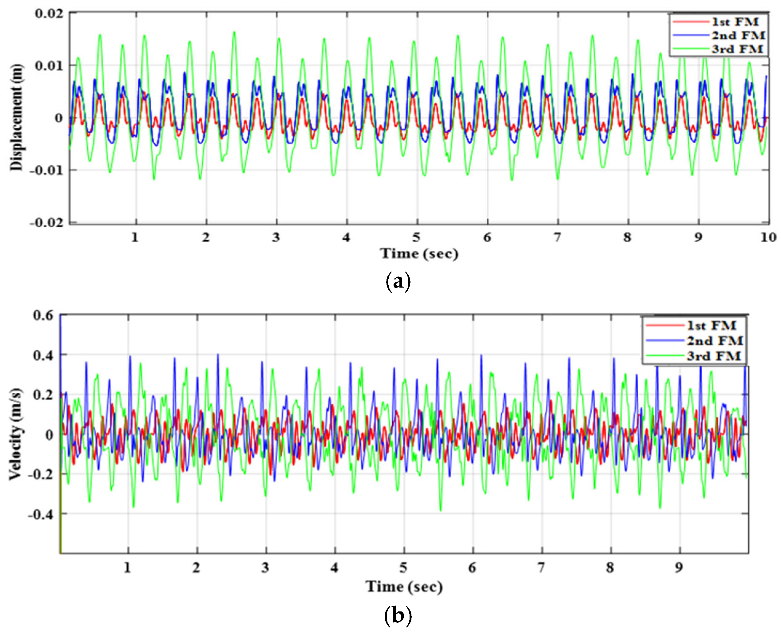 Figure 14, it can be observed that the third floating magnet (green curve) exhibited the highest displacement and velocity amplitudes, followed by the second and then the first magnet. This behaviour confirms that when the excitation is applied at the bottom stage, the energy transfer through the magnetic spring interactions accumulates toward the third magnet, resulting in the strongest dynamic response. The first magnet, located furthest from the point of excitation, demonstrated the smallest motion amplitude due to successive energy dissipation through the coupled system. Small phase differences among the curves further confirm the presence of multi-mode vibration rather than synchronous motion.