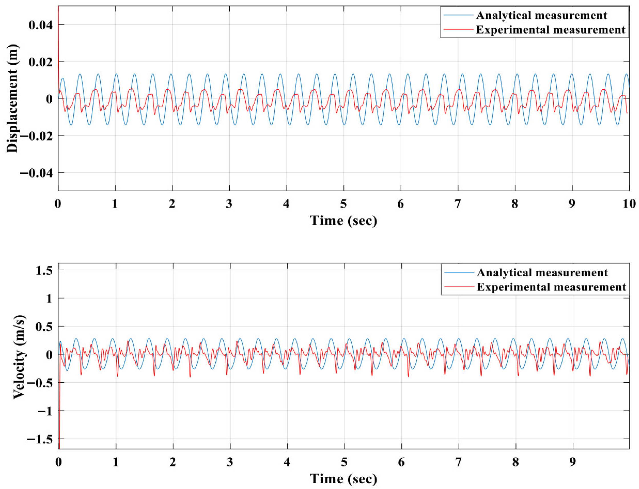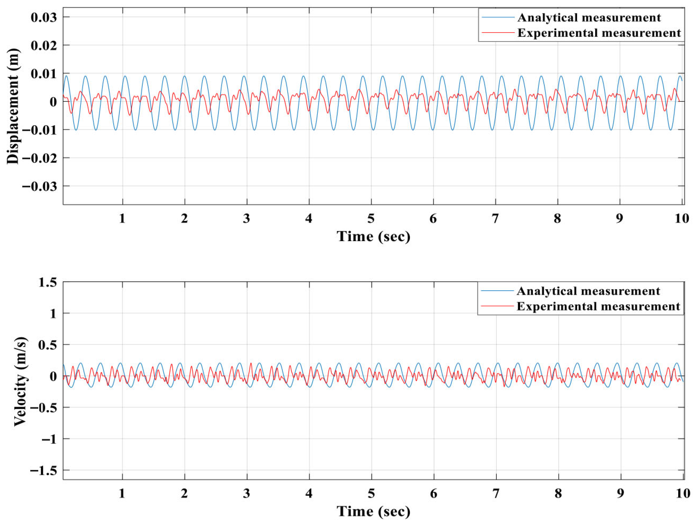 Figure 16), the analytical model overestimates displacement amplitude by approximately 20–25% compared with the experimental data, primarily due to neglected effects such as mechanical friction, imperfect magnetic alignment and damping nonlinearity in the physical prototype. Nevertheless, the phase trend and velocity waveform remain consistent, confirming that the stiffness and damping representation captures the overall dynamic response. In contrast, the second magnet (