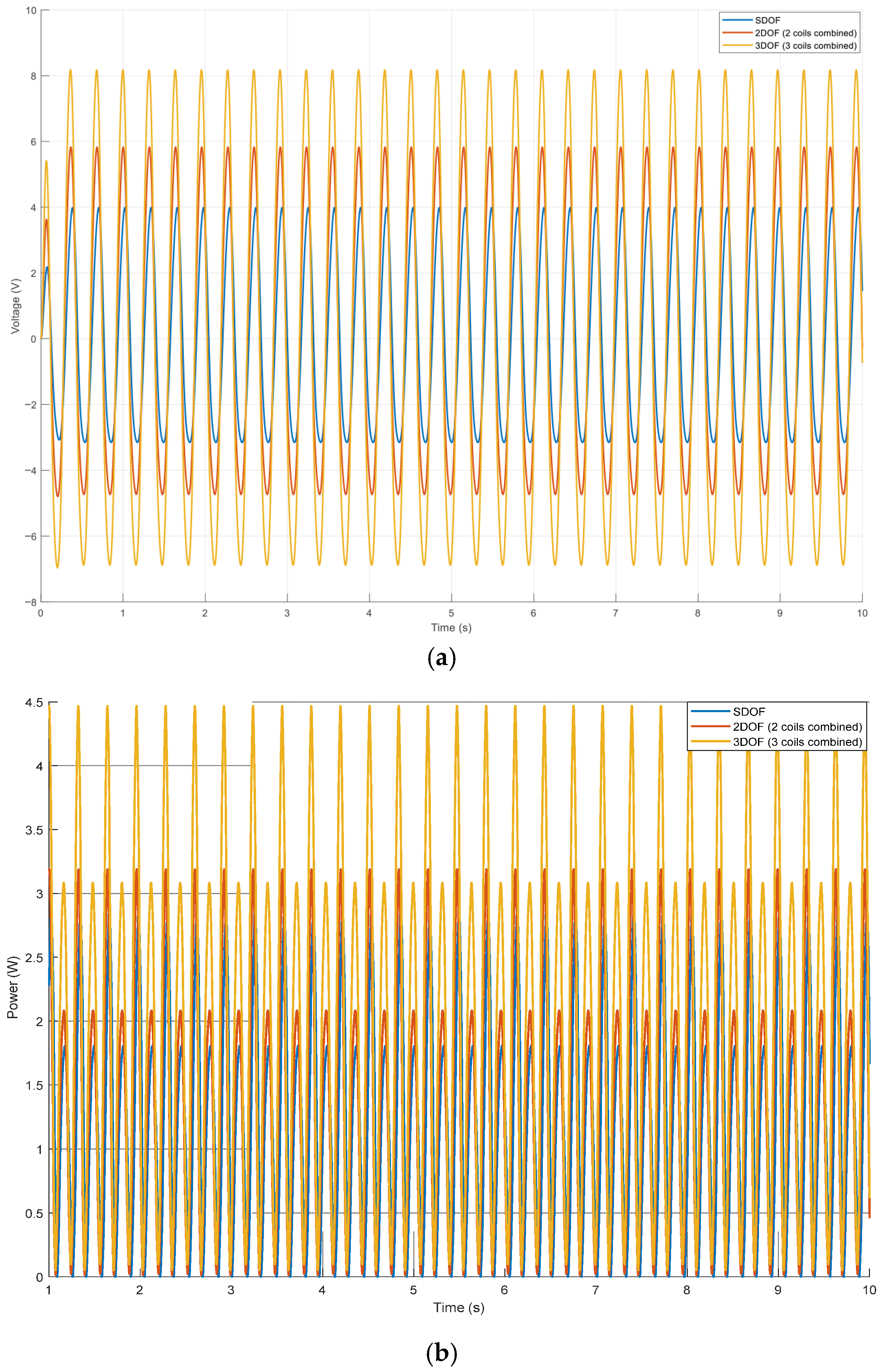 To quantify the benefit of the proposed 3DOF magnetic spring PTO relative to traditional designs, an equivalent SDOF baseline was constructed by constraining the upper two magnets in the validated 3DOF model. The total moving mass, effective linear stiffness and electromagnetic parameters (coil resistance, length and flux density) were preserved, and the same harmonic excitation (6.5 N amplitude and 3.13 Hz excitation) and load resistance were applied. Using this common framework, the RMS output voltage and average electrical power were computed for the SDOF, 2DOF and 3DOF configurations.