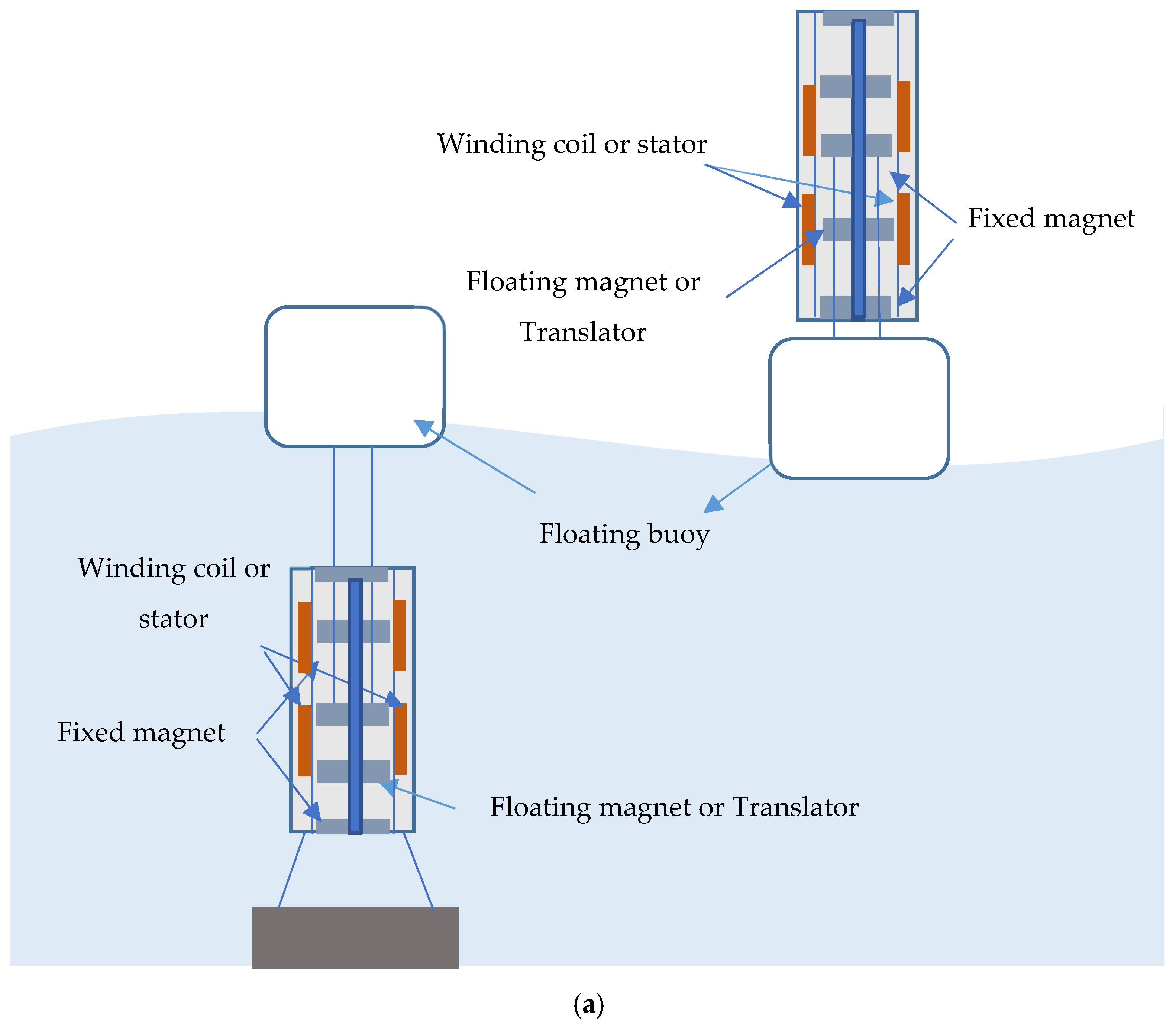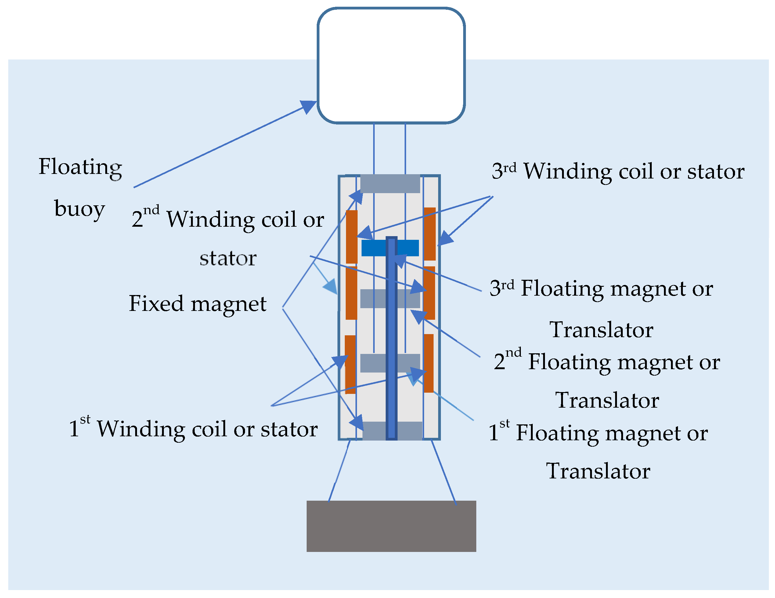 Figure 9. In the context of the 3DOF magnetic spring PTO, the buoy can be designed to house a compact generator column containing the three levitated magnets and their coils (