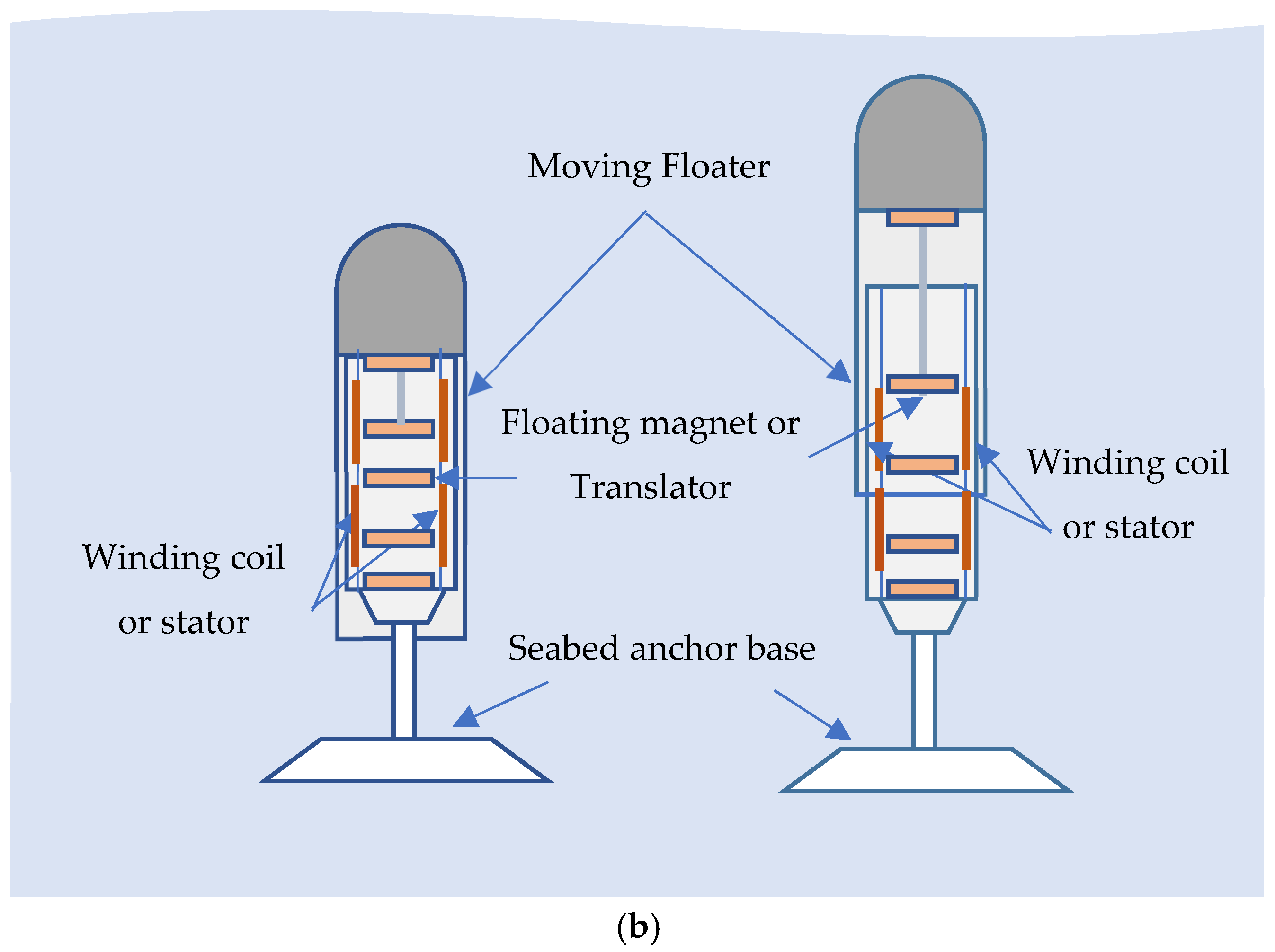 This section discusses how the PTO could be integrated into practical ocean wave energy converters (WECs). Point-absorber WECs consist of a buoy on the water’s surface attached to a mooring or reaction body. As waves pass, the buoy heaves up and down (and in some designs surges back and forth). A PTO located between the buoy and the mooring converts this relative motion into electricity.