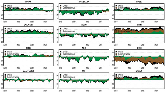 Specifically, the overall AI market is the primary transmitter of shocks, followed by the ESG market. Conversely, the brown market appears to be the primary recipient of information. Further analysis, breaking down this metric into its contemporaneous and lagged components, reveals induced spillover effects originating predominantly from the AI sector over the ESG market. For instance, the overall measure of BIAPR transmits approximately 11.6% to 20% of the information to the system during extreme market conditions. Similarly, GALPRAIP and EUSI transmit about 16% and 8%, respectively. Between 6% and 10% of the remaining variation in oil and aluminum can be attributed to the system’s reception. Rare earths are the largest commodity traded on the brown market, with a decline of about −18% over time. Notably, the connectedness indices for ESG markets serve as the primary transmitters of information for most of the period.