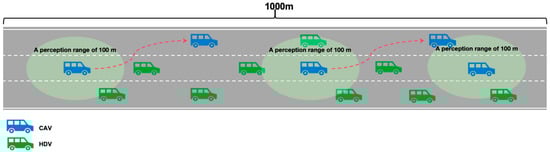 We designed a 1 km three-lane highway scenario, where the perception range of each autonomous vehicle was set to 100 m. According to different traffic densities, two groups of experimental conditions were established. The configurations of Connected and Autonomous Vehicles (CAVs) and Human-Driven Vehicles (HDVs) in each scenario were as follows. The highway traffic simulation scenario is illustrated in