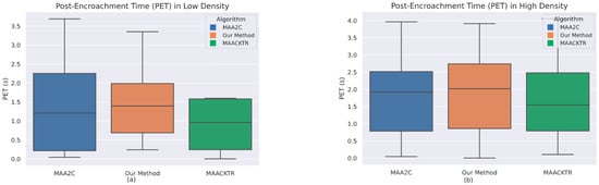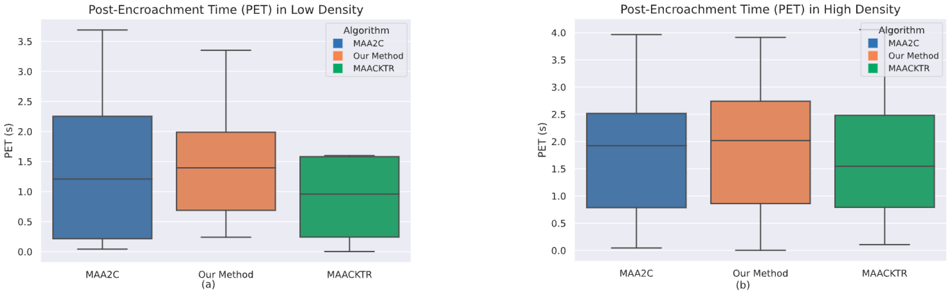 Figure 7a, in the low-density scenario, the proposed method achieved an average PET of 1.4 s, outperforming both Multi-Agent Advanced Actor–Critic (MAA2C, 1.2 s) and Multi-Agent Actor–Critic using Kronecker-Factored Trust Region (MAACKTR, 0.8 s). Since PET directly reflects the temporal safety margin at potential conflict points, its improvement provides quantitative evidence that our model more effectively suppresses short-term collision risk. The larger PET indicates that the ego vehicle preserves greater safety margins during interactions, highlighting the advantage of using PET as a risk-assessment metric.