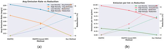Figure 8 shows the variations in average emission rate (mg/s) and the corresponding carbon emission per kilometer (g/km), reflecting both instantaneous emission intensity and overall trip efficiency. Under the proposed method, emissions decrease from 126.44 mg/s to 120.0 mg/s (8.01 g/km) in low-density traffic, and from 120.96 mg/s to 110.82 mg/s (9.11 g/km) in high-density traffic, corresponding to reductions of 5.1% and 8.4%, respectively. These results indicate that the strategy effectively lowers carbon emissions by smoothing acceleration and regulating longitudinal control, with greater benefits under high-density conditions where frequent stop–go maneuvers amplify emission fluctuations.
