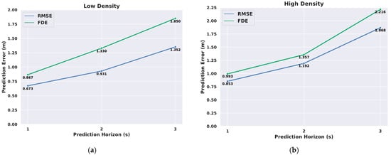 Figure 9, both RMSE and FDE increase gradually as the prediction horizon extends from 1 s to 3 s, reflecting the accumulation of predictive uncertainty over time. Under low-density conditions, the mean RMSE increases from 0.673 m (1 s) to 1.352 m (3 s), while FDE grows from 0.867 m to 1.850 m. This corresponds to an overall growth factor of 2.06× in RMSE, indicating a moderate accumulation of position deviation with time.
