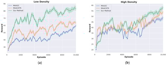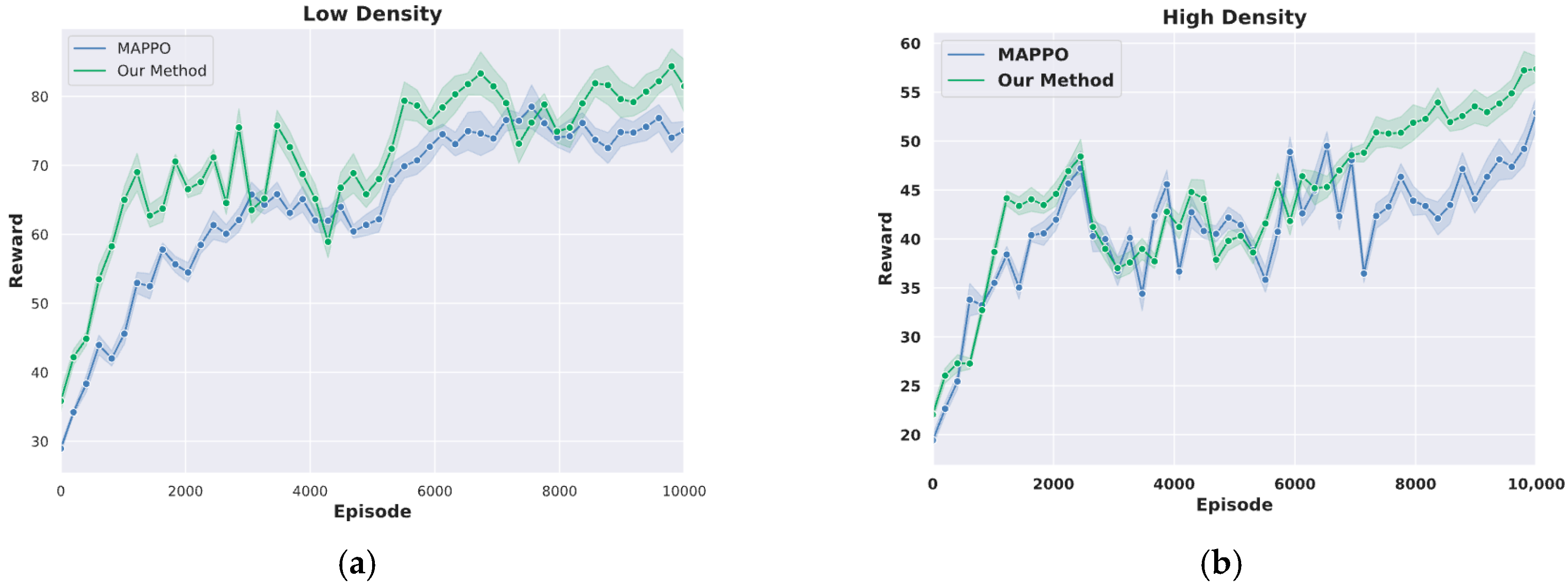 Figure 10b, in high-density scenarios, our method achieves an average reward of 58.28, exceeding the baseline MAPPO’s 52.38 by 11.26%. Moreover, our method demonstrates superior performance stability. In the low-density scenario, our method achieved an average speed of 25.52 m/s, compared with 23.03 m/s for baseline MAPPO (an improvement of 10.81%). In the high-density scenario, although average speeds of both methods declined to around 22 m/s due to congestion, our method exhibited a smaller standard deviation, indicating more stable driving performance.