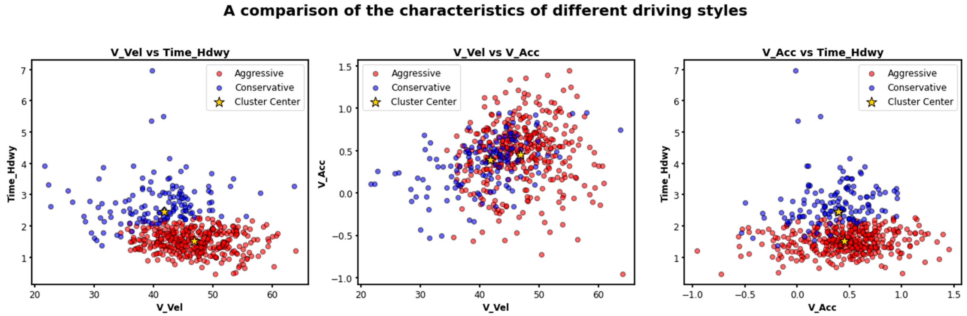 Figure 5 illustrates the clustering results of the driving style experiment using the K-means++ algorithm. Each point represents a sample of vehicle behavior, with colors indicating two primary driving style groups: aggressive (red) and cautious (blue). The scatter plots reveal clear separation patterns in the relationships among speed, acceleration, and time headway. The clustering centers provide quantitative insights into the driving styles: