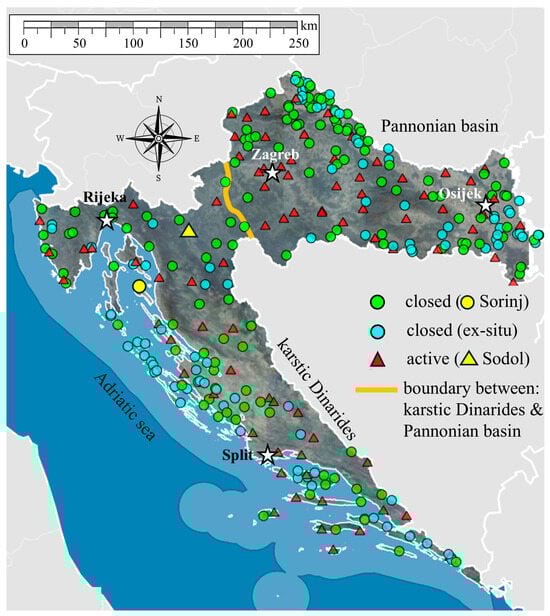 Croatia is particularly relevant for such research, as approximately 50% of its land area is composed of karstic rock formations [26]. According to the most recent Eurostat data [27], Croatia continues to dispose a dominant share of municipal waste in landfills, with recycling rates being on the rise and only a small portion of waste being used for energy recovery. Despite gradual progress in separate waste collection, the overall proportion of recycled or valorized waste remains modest, while the share processed through waste-to-energy routes is minimal. Preferred alternatives such as anaerobic digestion [28], advanced mechanical-biological treatment [29], and thermal recovery technologies [30] remain underdeveloped or unevenly implemented across the country. These trends highlight the need for clearer strategic measures and stronger infrastructure investment to reduce reliance on landfilling. Consequently, landfills remain a central component of Croatia’s waste-management system and therefore a critical subject of technical assessment and environmental monitoring. According to the most recent data [31], 307 municipal landfills are located across the country, of which 77 are still operational and 230 have been closed, Figure 3. In many cases, these landfills were not developed through a formal planning process. Instead, natural karst features, such as sinkholes, small karst fields (poljas), and valleys, were commonly used as disposal sites. Over time, many of these informal dumps evolved into official municipal landfills. While some were later upgraded to meet minimal operational standards, they were not constructed in accordance with modern environmental regulations. As a result, the majority are now undergoing remediation and eventual closure. This situation highlights the urgent need for effective investigation and remediation methodologies specifically tailored to complex karst environments. Moreover, many of these landfills are situated in the immediate vicinity of sensitive water bodies, increasing the potential risk of environmental contamination. For example, the Sodol landfill is located near the Dobra River, a typical karst river characterized by sinking and resurfacing flows, which makes it particularly vulnerable to pollutants. Similarly, the Sorinj landfill lies just next to the Adriatic Sea, posing a direct threat to coastal and marine ecosystems.