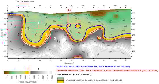 The seismic refraction profile RF-2 (Figure 9) extends over 170 m and is positioned approximately parallel to the electrical tomography profile (Figure 5b). On the interpreted profile, the boundary between the waste, including the leachate zone, and the underlying rock is delineated by a blue line. At this site, the rock mass corresponds to the upper weathering zone, composed of scree and highly fractured carbonate rock. The seismic wave velocities within the rock mass exceed 1000 m/s, with velocities above 2000 m/s indicating reduced fracturing and a more competent carbonate bedrock.