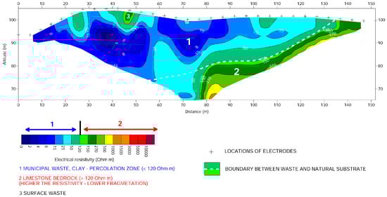 Resistivity values exceeding 120 Ω·m are indicative of the underlying carbonate bedrock. These higher values suggest decreasing fracturing of the carbonate rock with increasing resistivity, marking the transition from weathered to more competent bedrock, typically located below an average depth of 13 m. At the beginning of the profile (0 to 40 m), a developed surface previously used as an unloading ramp for waste deposition is evident. Overall, the ERT data reflect significant heterogeneity in the subsurface, including varying extents of surface waste, zones of leachate accumulation, and differing depths to the bedrock interface. The resistivity profiles also suggest complex lithological conditions, with potential structural features such as fractures or fault zones and variable degrees of material degradation along the length of the profile.
