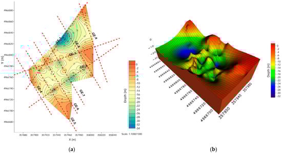 To provide a clearer visualization of the interpreted depth to the rock mass from the previously described geophysical investigations, presented as 2D interpreted depth profiles, a plan-view 2D representation and a 3D model are created. The 2D map for Sorinj landfill (Figure 10a) illustrates the spatial distribution of the depth to the rock mass, referenced to geodetic survey data, and integrates the positions of all completed ERT and SRT profiles. This spatial arrangement also illustrates where the density of geophysical data is highest and where the interpreted surface relies more on interpolation, highlighting the strengths and limitations of the subsurface model. This view enables direct comparison of depth variations between profiles and reveals lateral changes in the subsurface that cannot be fully appreciated from individual 2D sections alone.
