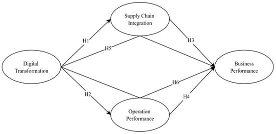 Prior literature has emphasized that DT can improve supply chain efficiency and performance, but these benefits are not automatic. Gains are realized only when DT is accompanied by effective integrative mechanisms. While automation and data integration contribute positively, digital technologies alone are insufficient without broader transformation strategies [7]. DT has been shown to enhance governance and market competitiveness [8], while advanced technologies such as blockchain, big data analytics, and IoT strengthen sustainable supply chain management and drive BP [9]. This challenge becomes even more apparent in sectors that depend on intensive multiactor coordination where DT remains at early or intermediate maturity and is hindered by issues of technological integration, data standardization, and stakeholder connectivity, all of which limit the ability of digital initiatives to deliver meaningful operational improvements [10,11]. To bridge the gap between digital potential and realized outcomes, researchers have increasingly examined the mediating roles of supply chain integration (SCI) and operational performance (OP) as critical mechanisms linking DT to BP. For instance, studies in Indonesia’s food and beverage industry found that digital supply chains and SCI significantly influenced OP, which in turn contributed to business outcomes [12]. Similarly, research in Indonesia demonstrated that SCI enhanced both operational and financial performance [13]. However, limited research has explored how SCI and OP act as transformative mechanisms in bridging DT and BP, particularly in developing countries such as Indonesia.