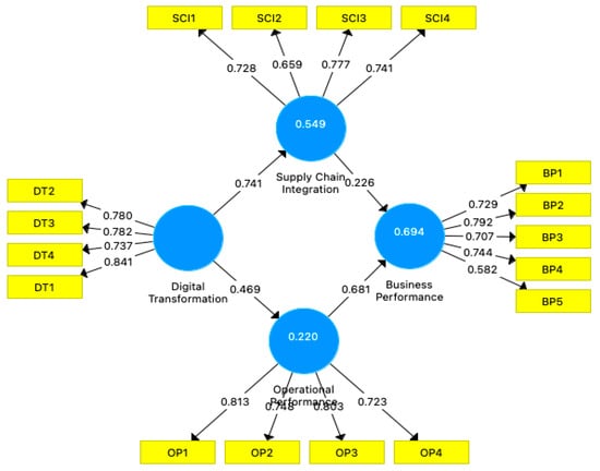 Table 2 presents the descriptive statistics for all measurement items used in the study. Overall, the results indicate relatively high mean scores across the core constructs suggesting generally positive managerial perceptions within Indonesian port organizations. The items measuring BP (BP1–BP5) exhibit mean values ranging from 6.09 to 6.33, with low-to-moderate standard deviations (0.78–0.95), indicating consistently strong performance assessments among respondents. DT items (DT1–DT4) show mean values between 5.69 and 6.14, accompanied by slightly higher variability (SD = 0.88–1.13), suggesting uneven digital adoption levels across port divisions. OP (OP1–OP4) demonstrates high and stable mean responses (6.09–6.16) with standard deviations below 0.92, reflecting a relatively homogeneous perception of operational efficiency. Meanwhile, SCI items (SCI1–SCI4) record mean scores between 5.87 and 6.13, with dispersion values ranging from 0.86 to 1.03, indicating moderate variability in integration practices. Across all constructs, the minimum and maximum values (1 to 7) confirm the full range of response utilization, supporting the appropriateness of the seven-point Likert scale and indicating sufficient discriminability among respondents. These descriptive statistics provide an initial overview of the respondents’ perceptions and support the subsequent reliability and validity assessments within the PLS-SEM framework.