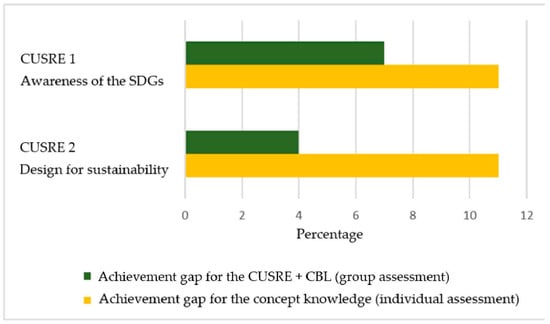 CUSRE 1 aimed to enhance understanding of the SDGs, allowing students to examine both the factual and ethical dimensions of sustainability. They cultivated positive behaviours that encourage a sustainability mindset and ethical comprehension while merging professional skills with engineering knowledge. During the analysis of gathered data, a disparity of 11% in IA was identified between low-achieving and high-achieving students. This gap narrowed to approximately 7% in GA within the CUSRE and CBL setting.