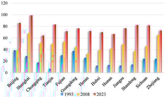 With the continuous escalation of global warming, climate change has become a major long-term global risk, significantly increasing the frequency and severity of disasters, posing a serious threat to economic and social activities [1,2]. The frequency of extreme heat events in China has increased significantly since the 20th century. Figure 1 shows the number of extreme hot days in China’s municipalities directly under the central government and the top 10 cities by GDP. Since 1993, extreme weather events in these economic centers have become increasingly intense, posing a potential risk to social development. Therefore, it is urgently necessary to enhance climate adaptability and environmental governance comprehensively. Green innovation (GI) is essential to create sustainable momentum [3]. It provides crucial support for enterprises to effectively cope with climate change fluctuations [4]. By using green technologies, enterprises can significantly reduce pollutant emissions and environmental risks. Therefore, research on strategies for improving the quantity and quality of enterprises’ green innovation (Q&Q) should be given attention.