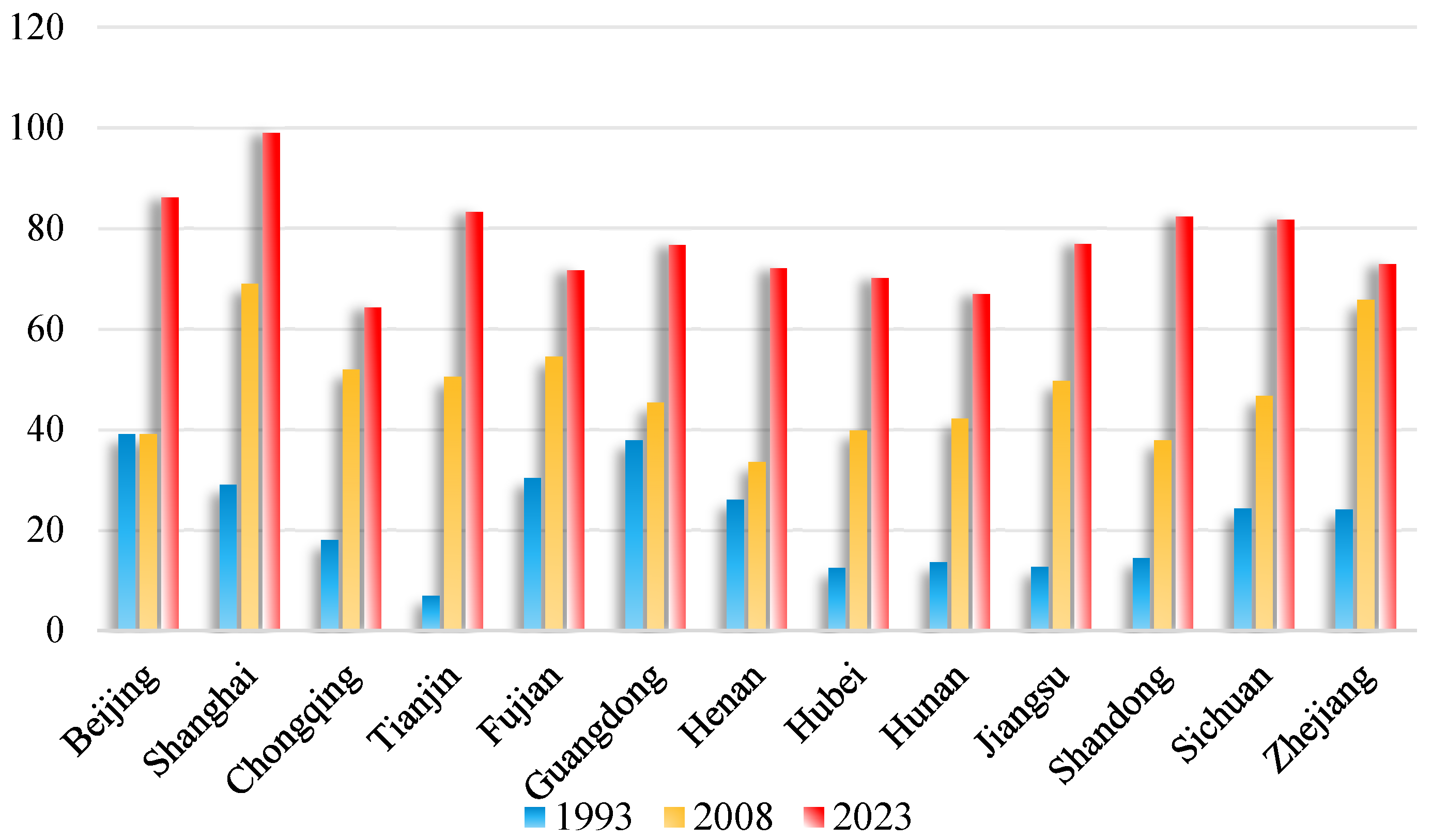 With the continuous escalation of global warming, climate change has become a major long-term global risk, significantly increasing the frequency and severity of disasters, posing a serious threat to economic and social activities [1,2]. The frequency of extreme heat events in China has increased significantly since the 20th century. Figure 1 shows the number of extreme hot days in China’s municipalities directly under the central government and the top 10 cities by GDP. Since 1993, extreme weather events in these economic centers have become increasingly intense, posing a potential risk to social development. Therefore, it is urgently necessary to enhance climate adaptability and environmental governance comprehensively. Green innovation (GI) is essential to create sustainable momentum [3]. It provides crucial support for enterprises to effectively cope with climate change fluctuations [4]. By using green technologies, enterprises can significantly reduce pollutant emissions and environmental risks. Therefore, research on strategies for improving the quantity and quality of enterprises’ green innovation (Q&Q) should be given attention.
