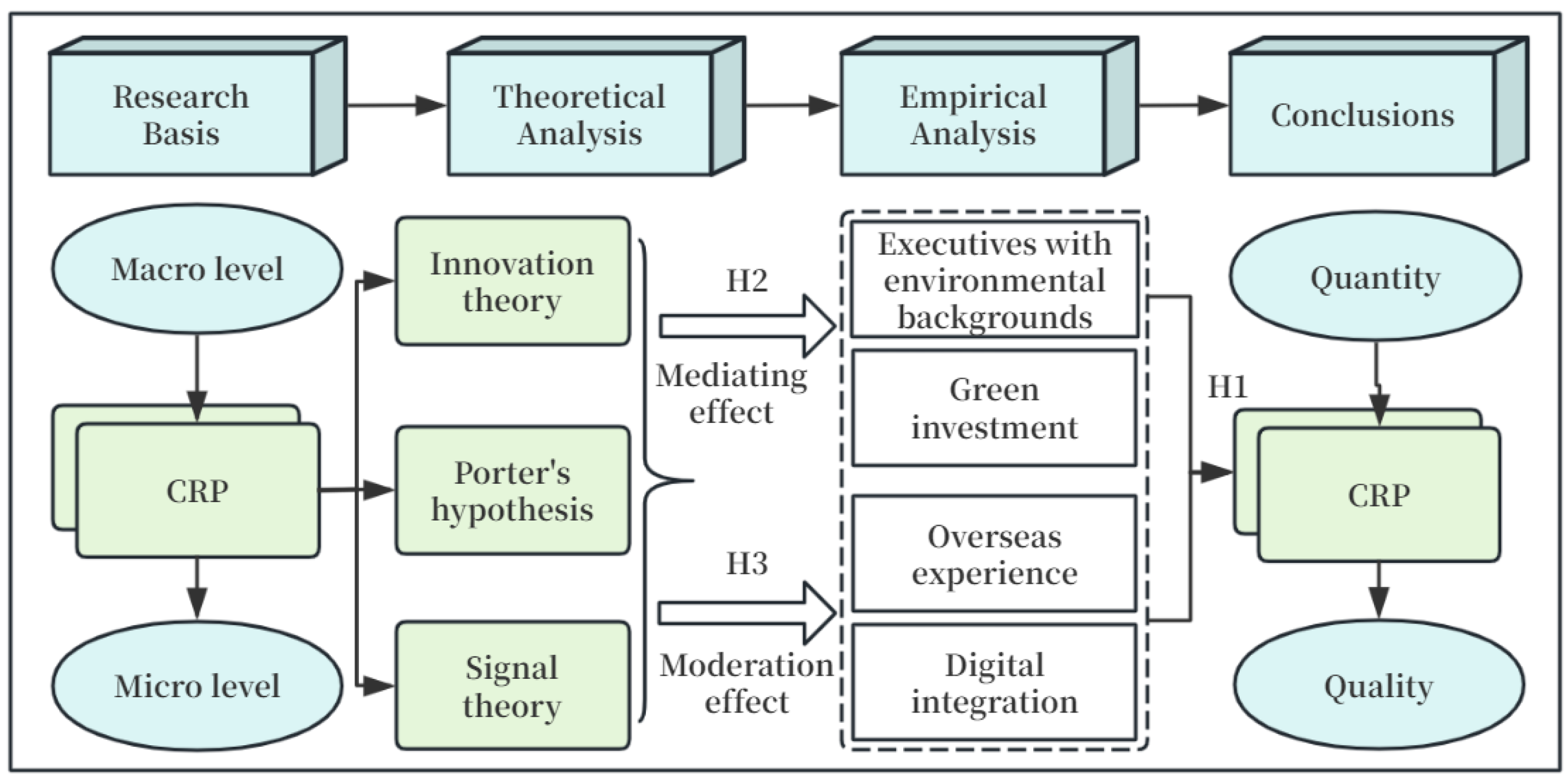 From the perspective of internal executives, those with overseas management experience are more familiar with international climate governance practices and can make systematic, innovative decisions by keenly transforming CRP [26]. This global perspective prompts enterprises to prioritize the layout of technologies with international compatibility when pursuing patents, rather than simply complying with environmental regulations. Additionally, the cognitive flexibility gained from overseas experience can help mitigate the tendency toward defensive innovation. The signal theory suggests that the overseas experience of senior executives, as a reliable signal of capability, can not only effectively attract the attention of domestic and foreign investors and partners [50] but also help enterprises obtain better opportunities for green technology cooperation. In conclusion, the primary structure of this paper is depicted in Figure 2. Therefore, we propose the following: