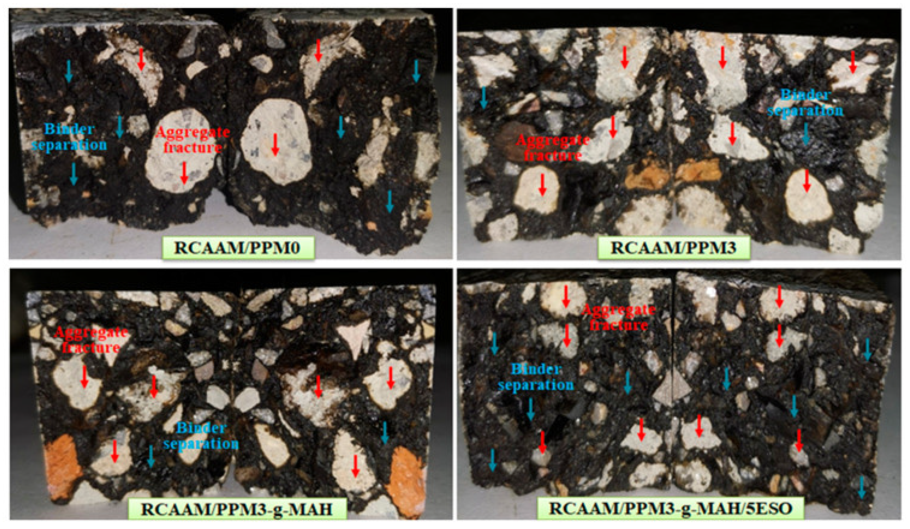 - The mixture performance indicated that the incorporation of a moderate and well-dispersed amount of WPP in asphalt mixtures can effectively enhance high-temperature stability and moisture resistance by improving hydrophobicity and interfacial bonding. However, excessive WPP content or poor dispersion may lead to increased stiffness and reduced crack resistance at low temperatures, emphasizing the importance of optimizing both dosage and dispersion for balanced performance.