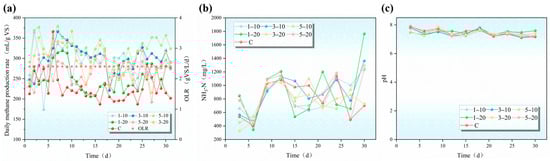 Figure 1a indicates that inoculum dosage and dosage frequency both significantly affect the methane production rate of AD. The daily average methane production rates of 1–10, 3–10, 5–10, 1–20, 3–20, and 5–20 were 289.39 mL/g VS, 301.12 mL/g VS, 325.24 mL/g VS, 251.58 mL/g VS, 292.75 mL/g VS, and 263.33 mL/g VS, respectively, and that of the C group was 227.11 mL/g VS. The daily average methane production rates of the experiments with a low dosage frequency (inoculation once every 5 days) were all higher than those of the C group. Among them, the 5–10 group exhibited the highest daily methane production rate, increasing by 43.21% compared with the C group. The daily methane production rate of the 1–20 group was close to that of the C group. This may possibly relate to the fact that the high inoculation frequency (once every day) and large inoculum dosage (20 g) led to microbial metabolic disorders, which offset the potential advantages of a high inoculation dosage. The poor methane production in the 1–20 group was possibly related to the introduction of excess exogenous microorganisms. Substrate competition occurred between the exogenous and original microorganisms. This inhibited the growth of acclimated microorganisms. For example, He et al. [15] found that bioaugmentation would change the archaeal community structure in the bioaugmentation-enhanced chicken manure anaerobic digestion, but the bioaugmentation efficiency was not the highest in the group with the highest inoculum dosage. Because inoculating with 10 g of granular sludge every 5 days presented a much better operating performance than the other groups, and the operating costs were relatively low, it was therefore selected as the optimal operating condition.