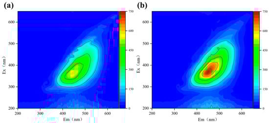 Figure 2 presents the three-dimensional fluorescence spectroscopy of the C group and the 5–10 group. The characteristic fluorescence peaks in the excitation (Ex) wavelength range of 300–500 nm and an emission (Em) wavelength range of 350–600 nm were observed in both the C group (Figure 2a) and the 5–10 group (Figure 2b). Notably, the 5–10 group exhibited higher fluorescence intensity than the C group in the characteristic spectral region of humic acid-like substances (Ex 250–450 nm/Em 380–550 nm) [19]. This result indicated that the 5–10 group generated more humic acid-like substances. It is worth noting that the humic acid-like substances function as electron shuttles [20], thereby further facilitating the direct interspecies electron transfer among microorganisms in AD. Yuan. Y et al. [21] found that some humic substances could act as terminal electron acceptors, accepting and transferring electrons between the acidogenic bacteria and methanogens. One study [22] indicated that quinone groups were the main electron transfer groups in humic substances that enhance the DIET pathway. It was reported that the concentrations of humic substances and redox functional groups determined the electron transfer capacity, with optimal concentrations of 5–10 mg/L [23]. Three-dimensional fluorescence results indicated that the concentration of humic substances in the 5–10 group was higher than that in the C group. This enhancement was likely related to the inoculated granular sludge, which stimulated the synthesis of humic acid-like substances, thereby strengthening the electron transfer network between bacteria and archaea. Humic substances could act as electron acceptors, further facilitating electron transfer between acidogenic bacteria and methanogens, and further enhancing methane production. This indicates that the addition of granular sludge was beneficial for the production of humic substances. The three-dimensional fluorescence results were consistent with the finding that the daily methane production rate of the 5–10 group was higher than that of the C group.