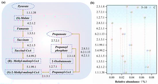 The propionate biosynthesis pathway and the relative abundance of its enzyme-encoding genes are shown in Figure 5a,b. Propionyl-CoA, which is a key intermediate in the conversion of pyruvate to propionate, is synthesized through multiple enzymatic steps. Pyruvate is first converted to succinate via the catalytic actions of malate dehydrogenase (EC: 1.1.1.38), fumarate hydratase (EC: 4.2.1.2), and succinate dehydrogenase (EC: 1.3.5.1). Then, succinate is converted to propionyl-CoA by succinyl-CoA synthetase (EC: 6.2.1.5), methylmalonyl-CoA mutase (EC: 5.4.99.2), methylmalonyl-CoA/ethylmalonyl-CoA epimerase (EC: 5.1.99.1), and methylmalonyl-CoA carboxyltransferase 5S subunit (EC: 2.1.3.1). As shown in Figure 5b, the relative abundance of the above enzyme-encoding genes was significantly higher in the 5–10 group than in the C group, with increases of 16.15%, 6.98%, 1.86%, 6.37%, 7.53%, 9.75%, and 94.64%, respectively. Notably, the relative abundance of EC: 2.1.3.1 increased by 94.64%, suggesting it may be the critical factor in promoting the propionate biosynthesis pathway.