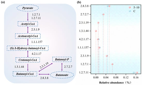 The butyrate production process and the relative abundance of the enzyme-encoding genes in the butyrate biosynthesis pathway are presented in Figure 6a and Figure 6b, respectively. Pyruvate is first converted to acetyl-CoA via 2-oxoacid oxidoreductase (EC: 1.2.7.11) or pyruvate ferredoxin oxidoreductase (EC: 1.2.7.1) (a detailed description of enzyme characteristics was provided in the acetate production section). Then, acetyl-CoA is converted to butyryl-CoA by acetyl-CoA C-acetyltransferase (EC: 2.3.1.9), 3-hydroxybutyryl-CoA dehydrogenase (EC: 1.1.1.157), enoyl-CoA hydratase (EC: 4.2.1.17), and trans-2-enoyl-CoA reductase (EC: 1.3.1.44). It is worth noting that despite the upregulation of EC: 1.3.1.44 and EC: 1.2.7.11 in the 5–10 group, the other genes decreased slightly (Figure 6b). Butyryl-CoA can be converted to butyrate through the following two pathways: (1) sequential catalysis by phosphate butyryltransferase (EC: 2.3.1.19) and butyrate kinase (EC: 2.7.2.7)—the former abundance was downregulated and the latter was upregulated; (2) direct conversion via acetate CoA/acetoacetate CoA-transferase (EC: 2.8.3.8), which increased from 0.0473% in the C group to 0.054% in the 5–10 group. It should be noted that the differential regulation of butyrate synthesis-related enzyme genes by granular sludge has limited regulatory effects.